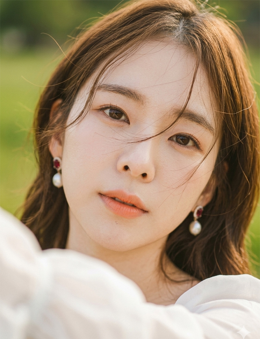 Her hair is loose, gently blown by the wind, creating natural motion. She wears elegant pearl earrings.