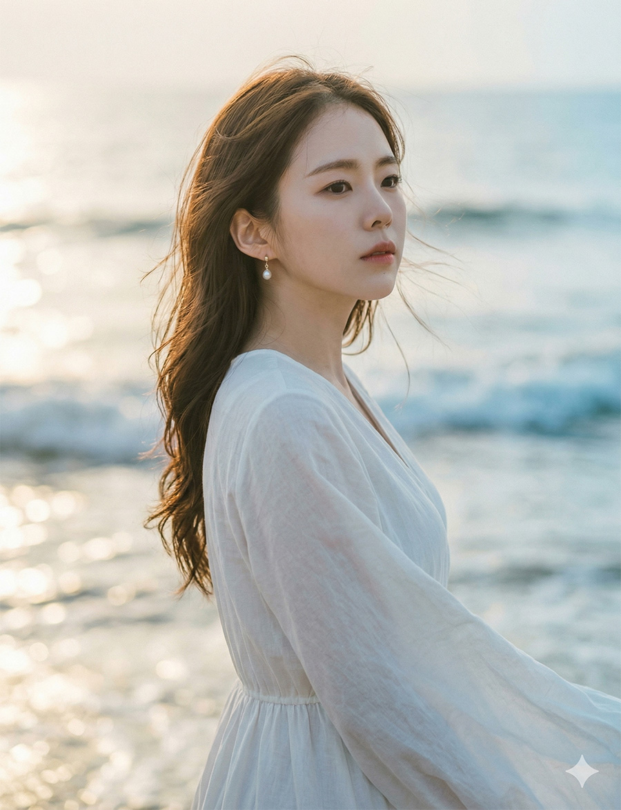 A cinematic portrait of a young Asian woman standing near the seaside, wearing a flowing white dress with light fabric moving in the ocean breeze. She gazes softly toward the horizon with a calm and slightly melancholic expression.