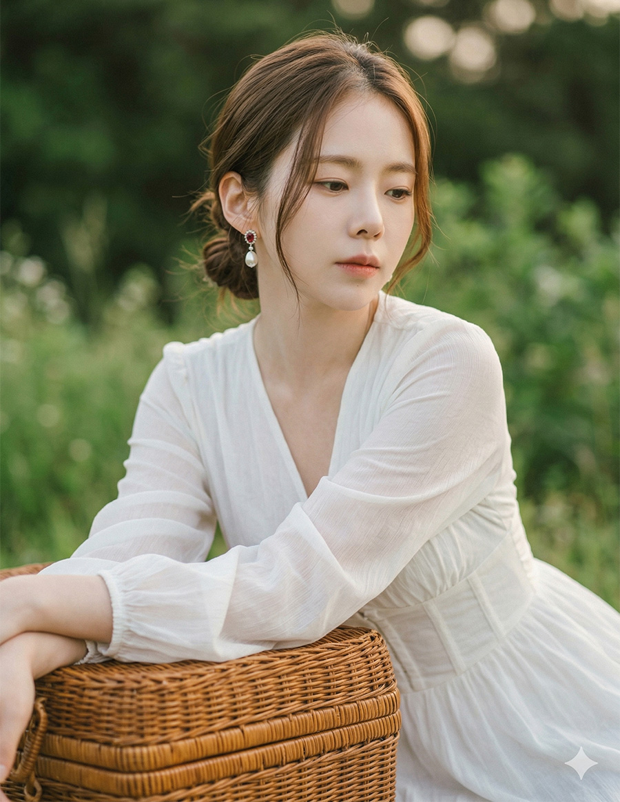 A soft cinematic portrait of a young Asian woman standing in a green grassy field, wearing a flowing white vintage dress with sheer long sleeves and a corset waist, natural makeup, soft pink lips, gentle expression, slightly melancholic mood. Her hair is loosely tied up with a few strands blowing in the wind. She is wearing pearl drop earrings.