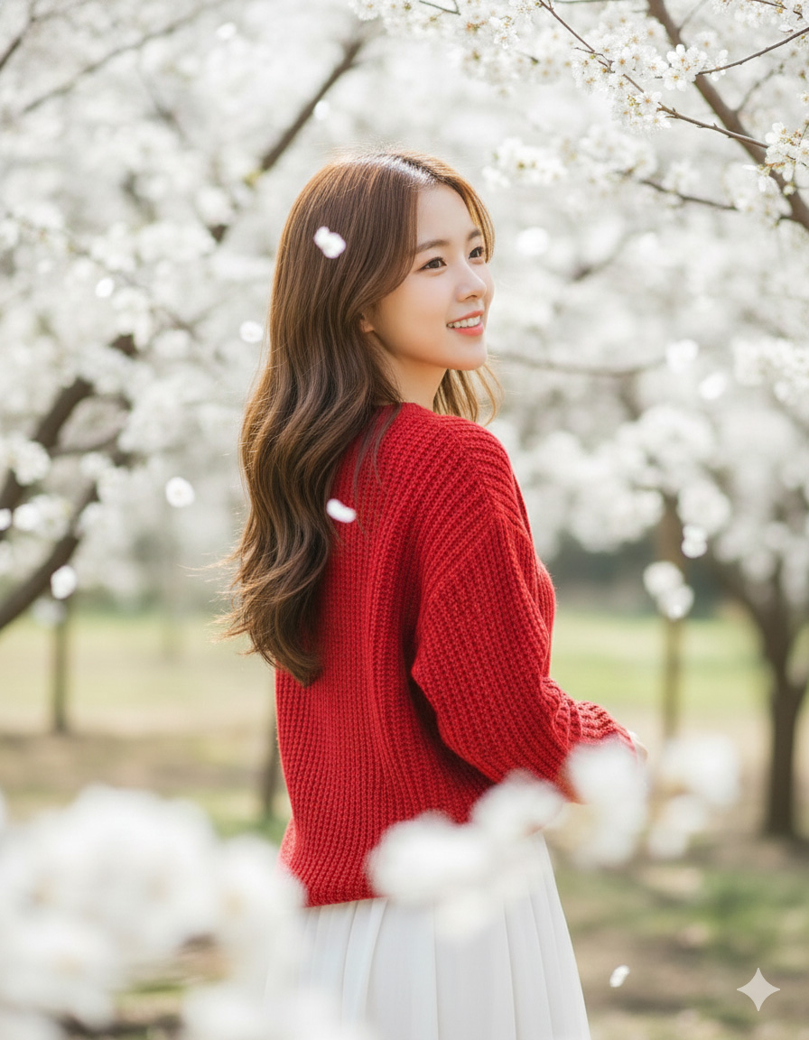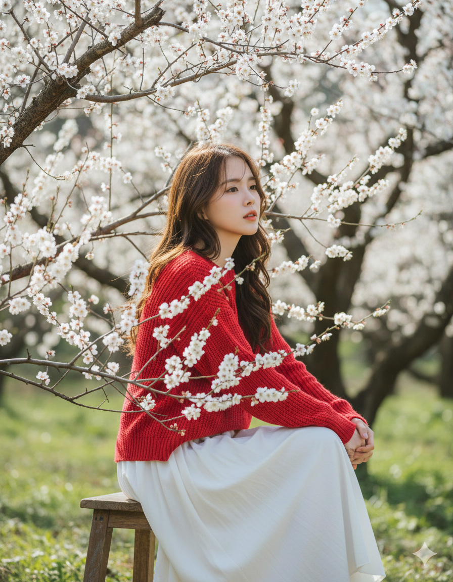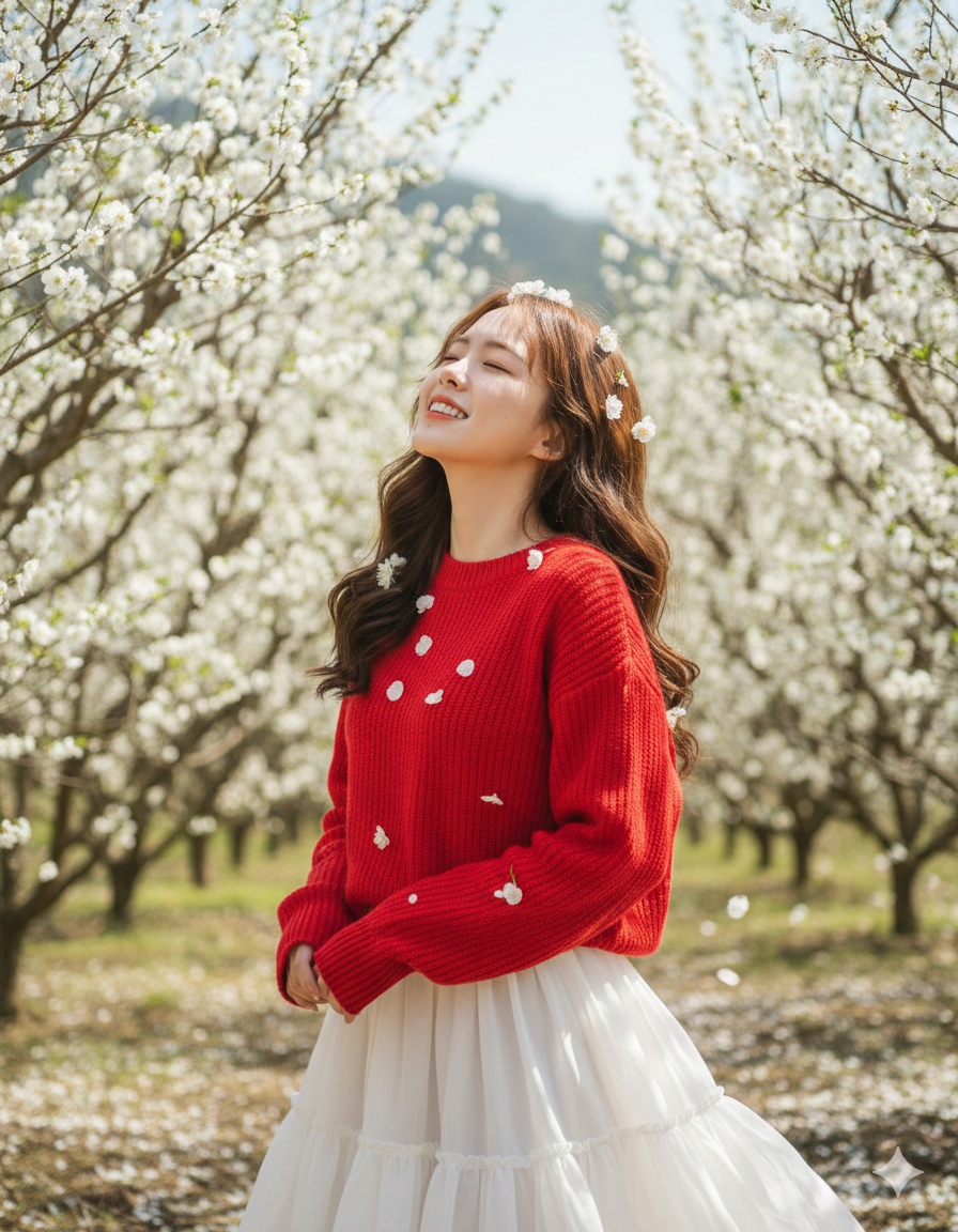 Tạo bức ảnh nghệ thuật chất lượng 8k, siêu thực, kích thước 9:16. Giữ nguyên 100% đường nét khuôn mặt, ngũ quan và đặc điểm nhận dạng của ảnh chân dung. Nhân vật có biểu cảm nhẹ nhàng, ánh mắt hơi tò mò nhìn sang bên trái, miệng khẽ hé mở. Ánh sáng tự nhiên mềm mại, chiếu đều từ phía trước, tạo hiệu ứng mờ ảo nhẹ cho hậu cảnh, tông màu tổng thể tươi sáng, trong trẻo, mang không khí mùa xuân. Tóc dài màu nâu hạt dẻ uốn xoăn nhẹ thả tự nhiên, không đội mũ. Nhân vật mặc áo len cổ lọ màu đỏ tươi nổi bật, chân váy dài trắng nhiều lớp bồng bềnh, đi giày bệt màu đỏ. Đứng giữa một vườn hoa mận trắng nở rộ, phía sau là những hàng cây xanh mờ ảo. Làn da trắng sáng hồng hào.