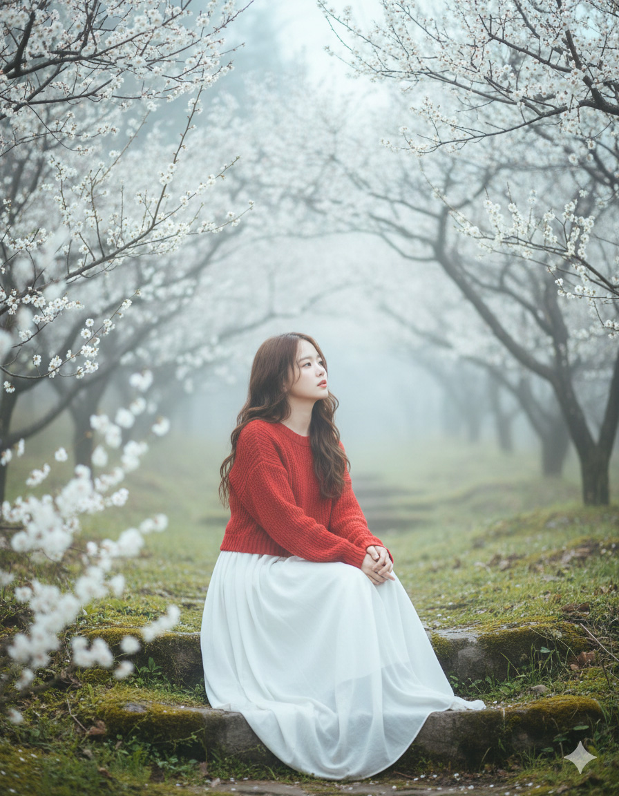 Tạo bức ảnh nghệ thuật chất lượng 8k, siêu thực, kích thước 9:16. Giữ nguyên 100% đường nét khuôn mặt, ngũ quan và đặc điểm nhận dạng của ảnh chân dung. Nhân vật có biểu cảm nhẹ nhàng, ánh mắt nhìn xa xăm sang bên trái, nét mặt hơi suy tư. Ánh sáng tự nhiên mềm mại, mờ ảo, tạo hiệu ứng bokeh ở tiền cảnh và hậu cảnh, tông màu chủ đạo là trắng tinh khôi của hoa, xanh lá cây và đỏ tươi, tổng thể ảnh sáng và có chút sương mờ. Nhân vật có mái tóc dài bồng bềnh, làn da trắng sáng hồng hào, mặc áo len màu đỏ tươi nổi bật, váy dài màu trắng tinh khôi, đứng thẳng, tay phải nhẹ nhàng đưa lên gần cằm, nhìn nghiêng sang bên trái, trong một khu rừng hoa mận trắng nở rộ, bao phủ bởi sương khói mờ ảo, tạo không gian lãng mạn và huyền bí.