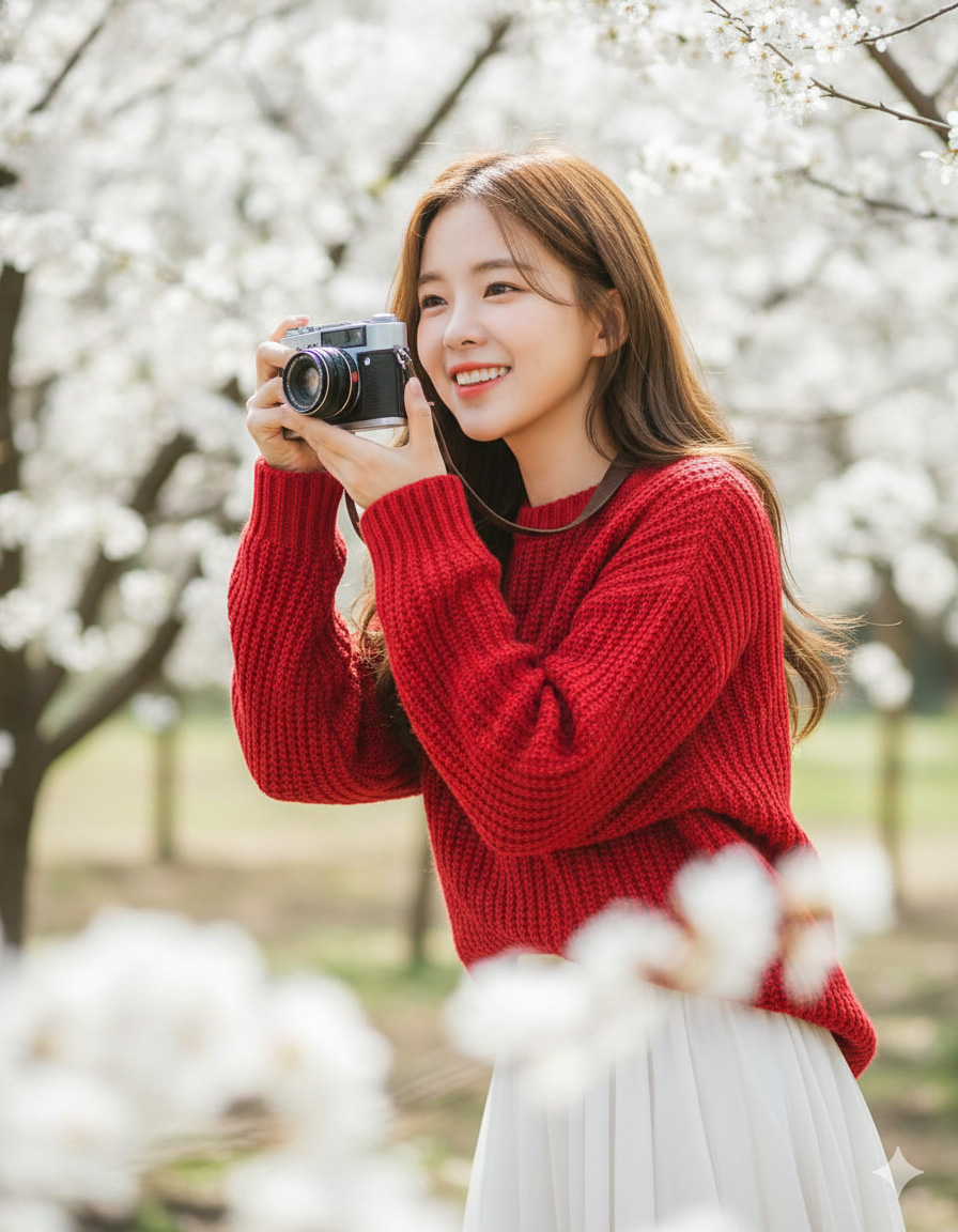 Tạo bức ảnh nghệ thuật chất lượng 8k, siêu thực, kích thước 9:16. Giữ nguyên 100% đường nét khuôn mặt, ngũ quan và đặc điểm nhận dạng của ảnh chân dung. Nhân vật có nụ cười tươi tắn, ánh mắt dịu dàng nhìn về phía trước, thể hiện sự tập trung và thích thú. Ánh sáng tự nhiên mềm mại, trong trẻo của ban ngày chiếu rọi đều khắp, tạo nên tông màu tổng thể tươi sáng, tinh khôi với sắc trắng chủ đạo của hoa nở rộ, làm nổi bật màu đỏ tươi của trang phục. Nhân vật nữ với mái tóc nâu dài uốn xoăn nhẹ, làn da trắng sáng hồng hào, đang đứng giữa rừng cây hoa trắng nở rộ. Cô ấy mặc áo len màu đỏ tươi nổi bật và váy trắng, hơi nghiêng người, hai tay cầm một chiếc máy ảnh vintage đưa lên ngang mặt như đang chụp ảnh, với phông nền mờ ảo của những cành hoa trắng tinh khôi và một vài cành hoa ở tiền cảnh.