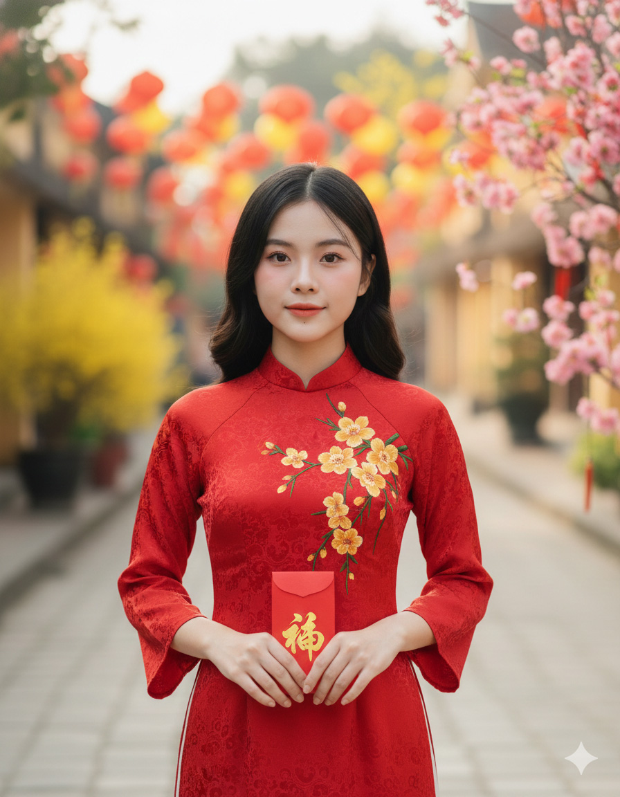Câu lệnh 5: Áo dài đỏ truyền thống, phong cách Tết cổ điển