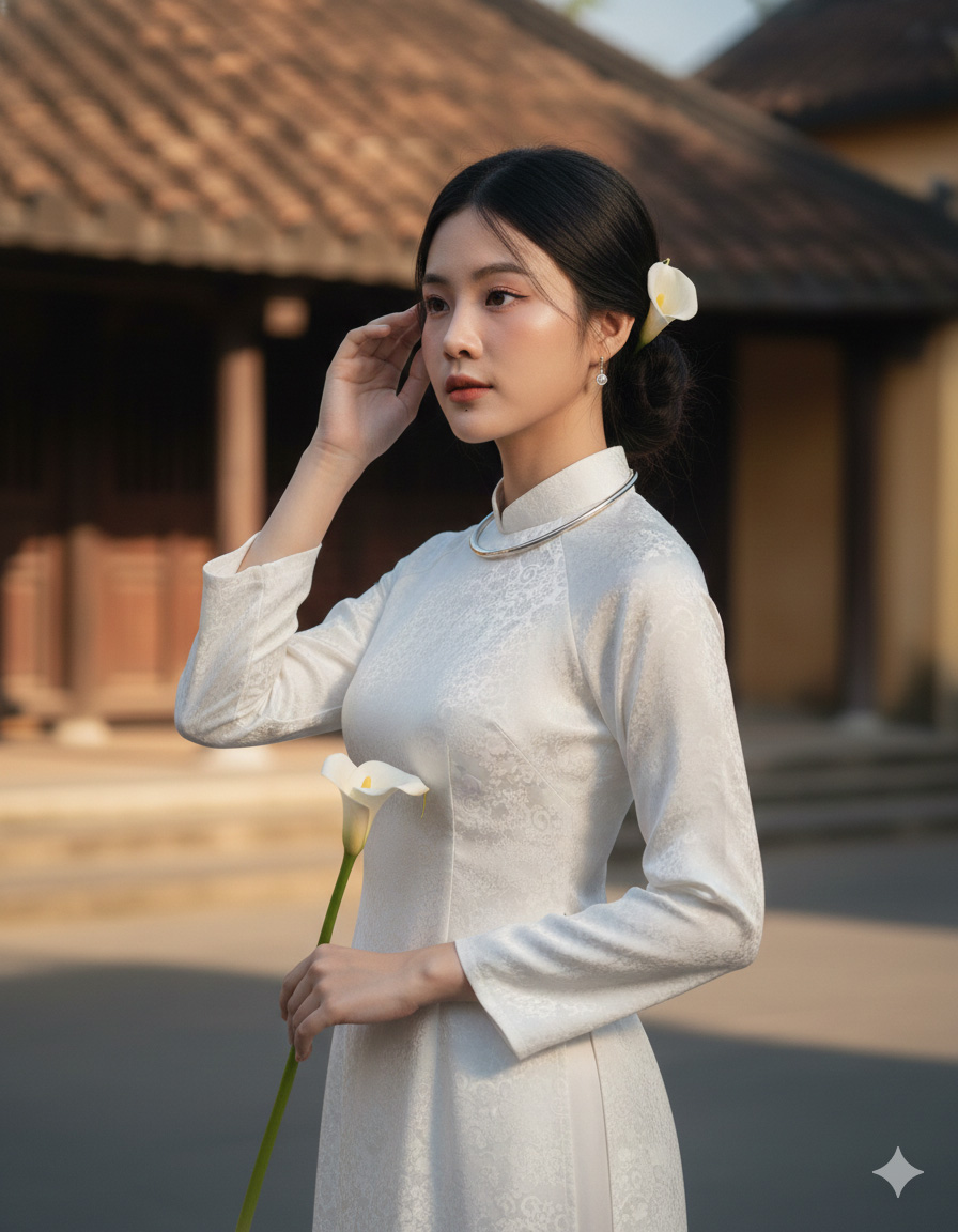 Accessories: She wears a simple silver kiềng cổ (Vietnamese traditional neck ring) and delicate drop earrings. A single white calla lily flower is gently held in one hand.