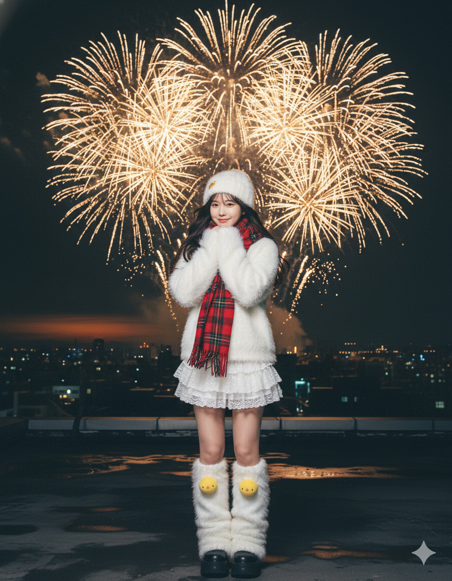 Full body photo of a girl with my face, recreating the exact pose and outfit from a reference image. She is standing on a dark rooftop at night, body angled, head tilted slightly, hands clasped together near her chin, long dark hair flowing in the wind. Outfit: a white fuzzy faux fur sweater, a white lace tiered mini skirt, a red and black plaid scarf, and a white fluffy beanie. She wears white fuzzy thigh-high leg warmers with tiny yellow chick accents at the top. Background: a dark night sky filled with massive exploding golden fireworks, a thin orange sunset glow on the horizon over a dark city silhouette. Style: High-quality flash photography, sharp focus on the girl, cinematic lighting, 8k resolution, ultra-detailed.