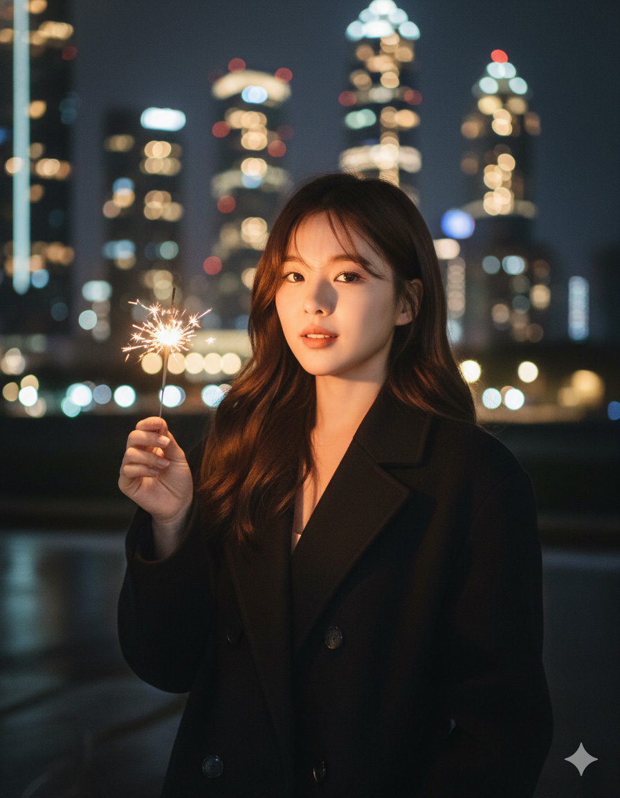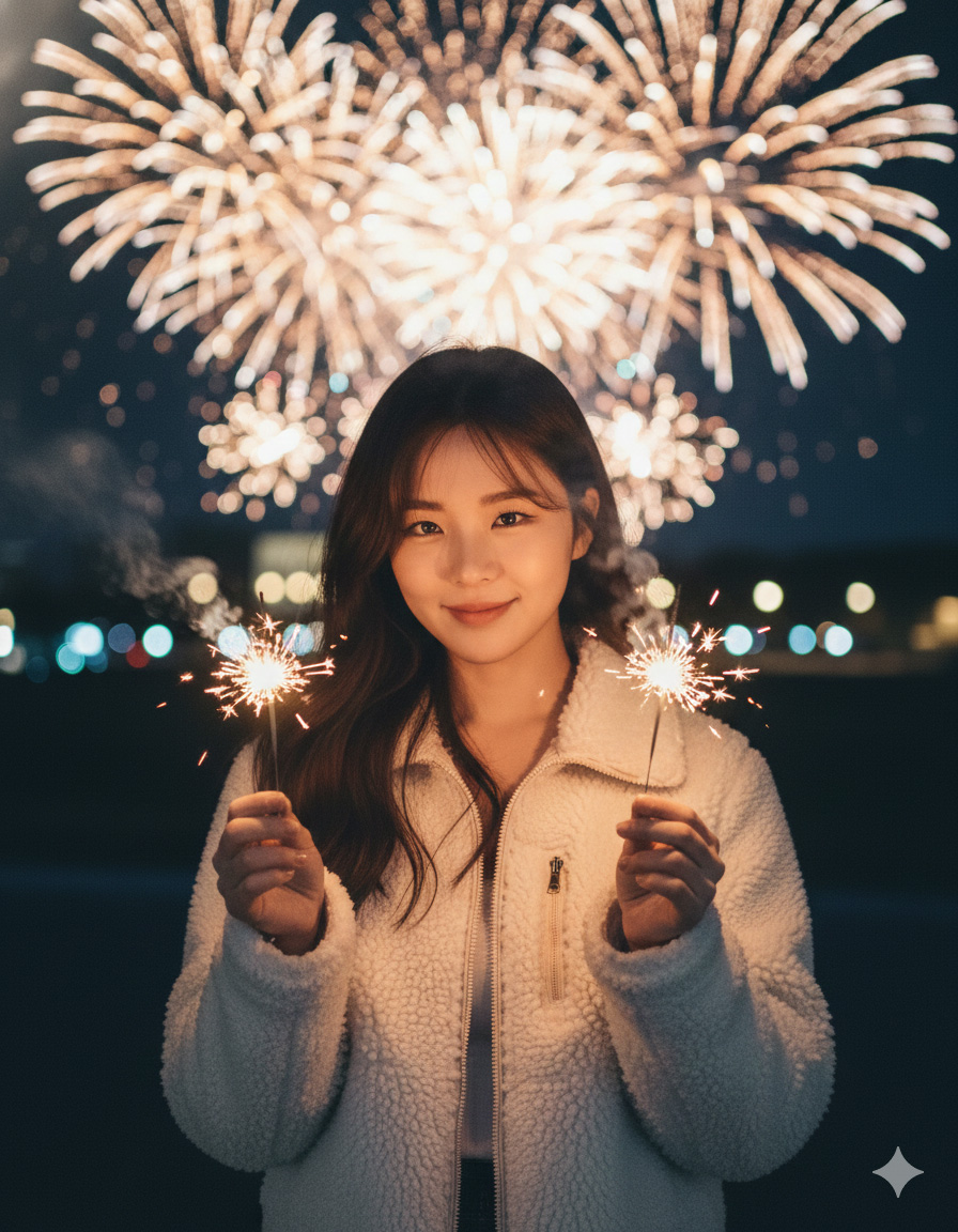 A cinematic portrait of a beautiful young Asian woman holding sparklers in both hands at night. She is wearing a cozy white fluffy fleece jacket (sherpa jacket). Her long black hair is slightly windblown. She has a gentle, sweet smile and is tilting her head slightly, looking directly at the camera. The background is a bright, bokeh blur of fireworks and city lights, creating a magical, dreamy, and festive New Year's Eve atmosphere. Soft lighting illuminating her face, sparks flying, high quality, photorealistic, 8k resolution, shallow depth of field.