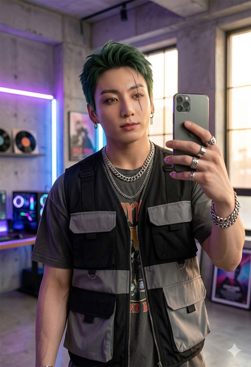 A man with short spiky green hair and a scar over his left eye, muscular and attractive, posing like a TikTok influencer. He is holding a phone as if taking a selfie video, slightly smirking. Wearing trendy streetwear with accessories. Background is a modern room with LED lights and soft glow. Lighting is bright, soft, and viral social media style, ultra realistic, 8K. Keep the face exactly the same as the reference image.
