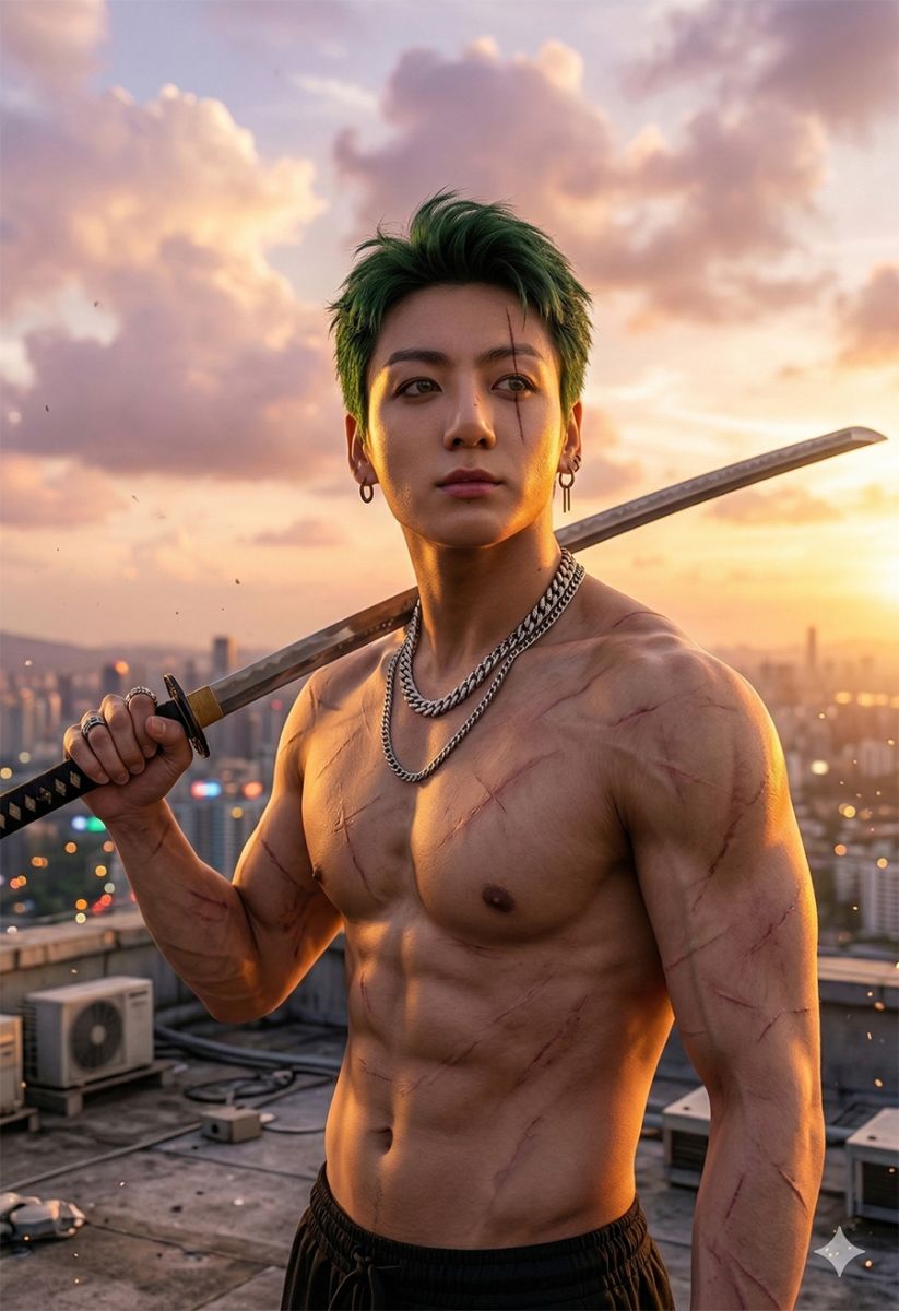 A man with spiky green hair and a scar over his left eye, muscular body with visible scars, standing on a rooftop during sunset. Warm golden sunlight hits his face and body, creating a cinematic and heroic mood. He holds a katana resting on his shoulder, looking into the distance. Dramatic sky, soft clouds, high detail, ultra realistic, 8K. Keep the face exactly the same as the reference image.