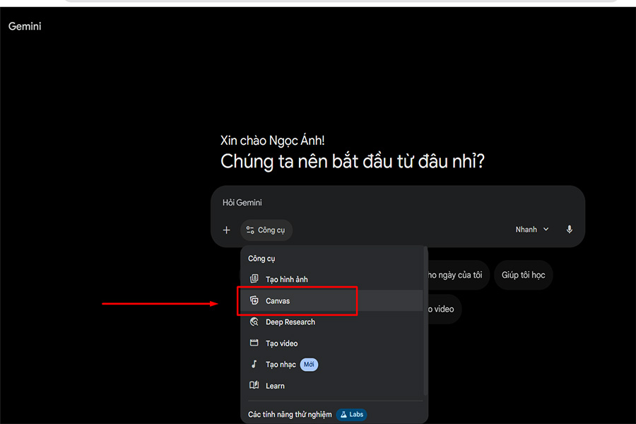 Sau khi đăng nhập thành công, giao diện trò chuyện với AI sẽ hiển thị. Tại đây, bạn hãy tìm mục Công cụ (Tools) trong thanh nhập lệnh và chọn Canvas. Đây là khu vực quan trọng giúp bạn vừa trò chuyện với AI, vừa xem và chỉnh sửa mã game được tạo ra một cách trực quan.