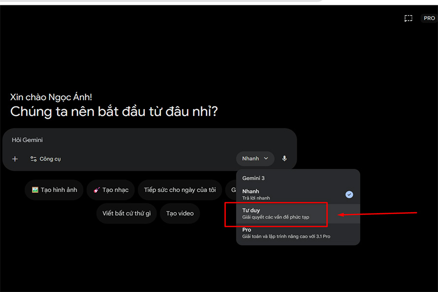 Gemini cung cấp nhiều chế độ xử lý khác nhau để phù hợp với từng nhu cầu. Khi tạo game, bạn nên chọn chế độ Tư duy (Thinking) để AI có thể phân tích logic sâu hơn và xây dựng cấu trúc game rõ ràng hơn. Điều này đặc biệt quan trọng với các trò chơi có luật chơi hoặc hệ thống tính điểm.