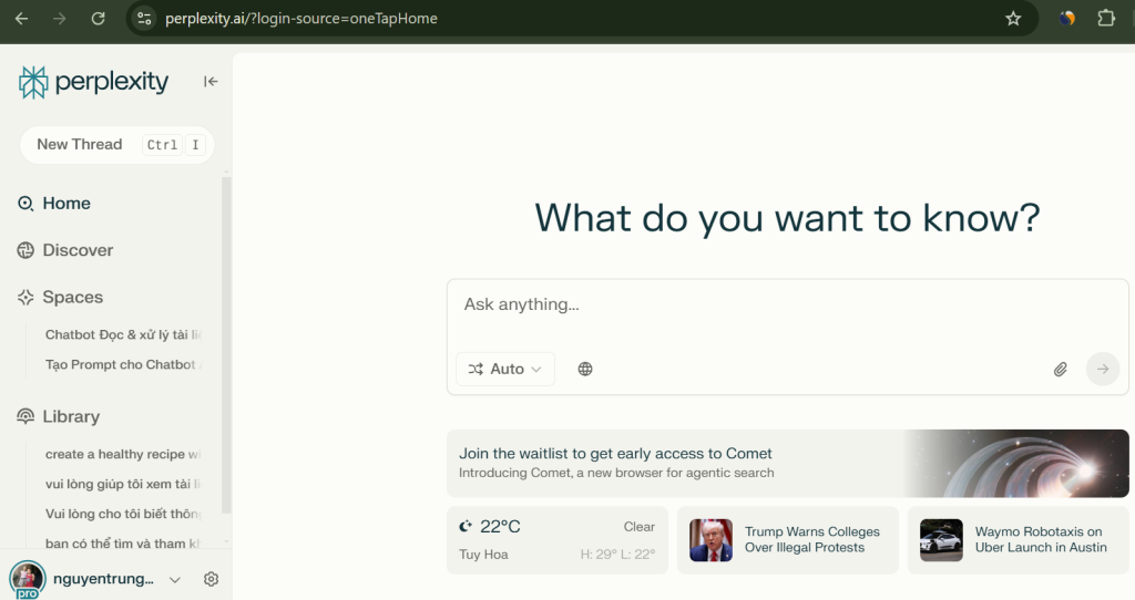 Perplexity: Có web/mobile, Threads (ghi nhớ ngữ cảnh hội thoại) và Spaces (kho tri thức – tổ chức theo chủ đề/dự án). Comet là trình duyệt AI hợp nhất tìm kiếm, tác vụ và trợ lý ngay trong sidebar.