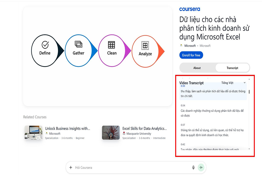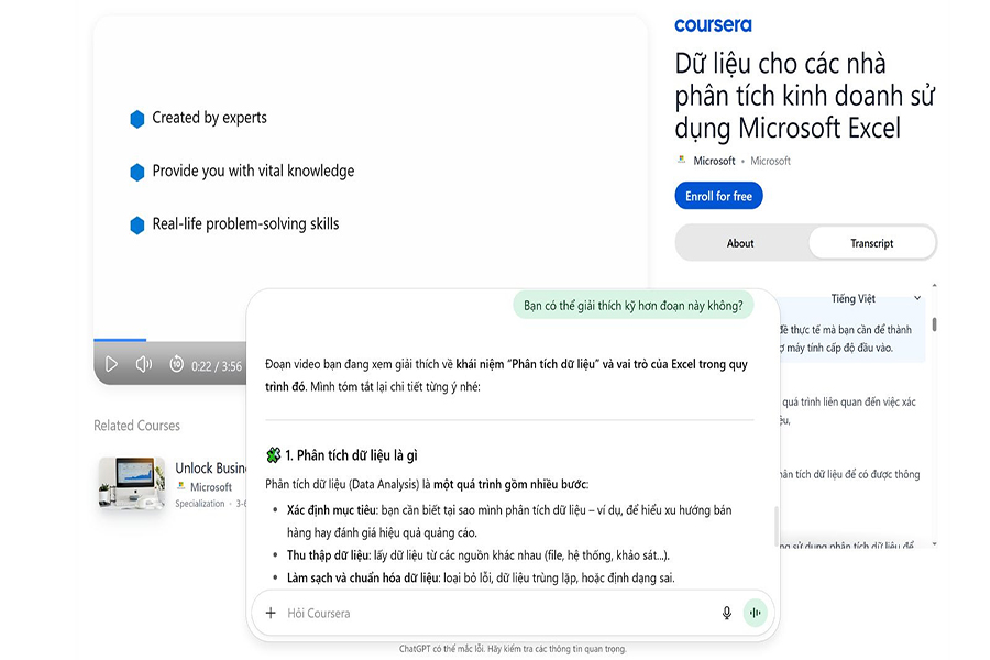 Khi mình thử dùng lệnh: “Coursera, tìm giúp mình một khóa học cơ bản về Excel để mình học phân tích dữ liệu.” Kết quả trả về rất nhanh và đúng với yêu cầu, giúp mình tiết kiệm đáng kể thời gian tìm kiếm. Nhưng điểm đáng giá nhất phải kể đến tính năng Transcript. Nó cho phép phiên dịch trực tiếp phụ đề từ tiếng Anh sang tiếng Việt. Theo mình, đây thực sự là một tính năng vô cùng quan trọng cho những ai muốn tiếp cận các khóa học quốc tế chất lượng cao nhưng còn e ngại rào cản ngôn ngữ.