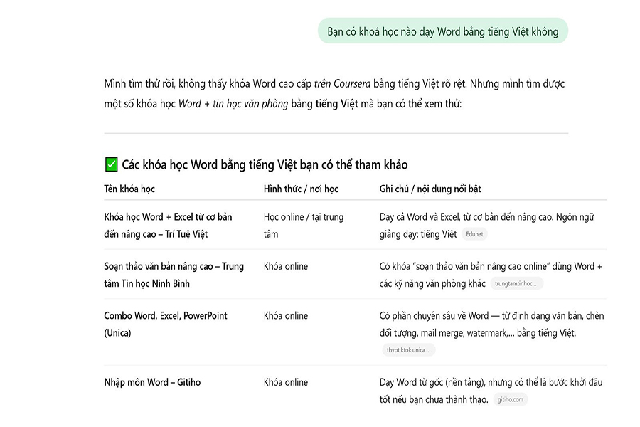 Theo quan điểm của mình, ưu điểm lớn nhất của tính năng này là duy trì được sự tập trung và liền mạch khi học. Mọi thắc mắc đều được giải quyết tại chỗ, giúp mình hoàn toàn đắm chìm vào bài giảng. Về hạn chế, mình có thử tìm khóa học bằng tiếng Việt với câu lệnh: ”Bạn có khoá học nào dạy Word bằng tiếng Việt không”. ChatGPT đã phản hồi rằng Coursera không có khóa học này và gợi ý tìm ở nền tảng khác. Cá nhân mình thấy đây chỉ là một hạn chế nhỏ và hoàn toàn chấp nhận được, bởi thế mạnh của Coursera là các khóa học chuyên sâu quốc tế, và việc có thêm công cụ phiên dịch của ChatGPT đã phần nào giải quyết được vấn đề ngôn ngữ rồi.