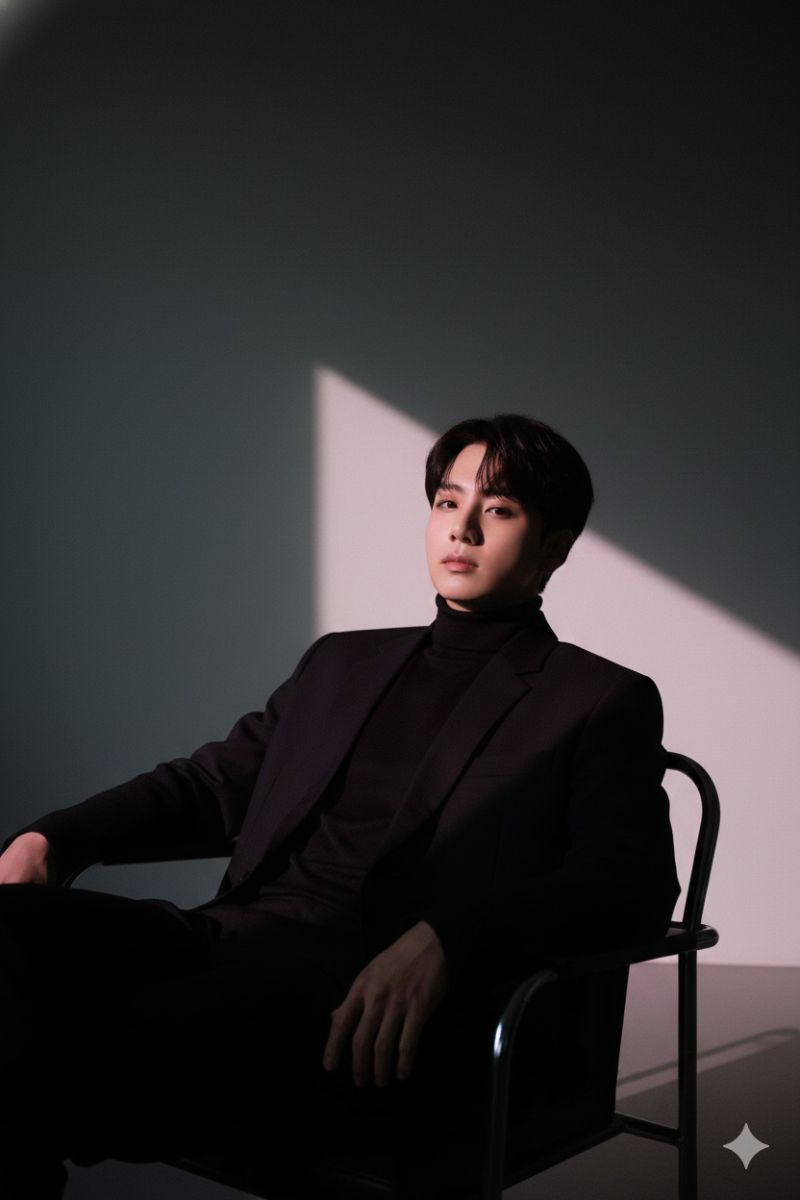 Using the uploaded photo, which retains the exact same facial features as the uploaded image, create a stylish 4K cinematic portrait of a young man seated in a modern chair in his home. He is framed in a 3/4 view, slightly leaning back, one hand resting comfortably on the chair, exuding calmness and confidence. The man possesses a refined face, sharp jawline, natural black hair, and a hairstyle that matches the uploaded image. He wears a sleek, all-black outfit consisting of a dark turtleneck and a fitted blazer, giving him a high-fashion look. The background is a dark, smooth wall illuminated by striking geometric patterns from the window, creating a soft pinkish-purple light that contrasts sharply with the shadows. The colored light falls on the wall and subtly highlights the hair and shoulders, emphasizing the dramatic atmosphere. The overall lighting has a dark and artistic feel with soft shadows and strong cinematic contrasts. The color scheme emphasizes deep blacks, muted skin tones, and vibrant pink accents, giving the magazine cover a stylish aesthetic. The vertical layout (9:16), with the subject slightly off-center, ensures no text, logos, or watermarks appear in the final image.