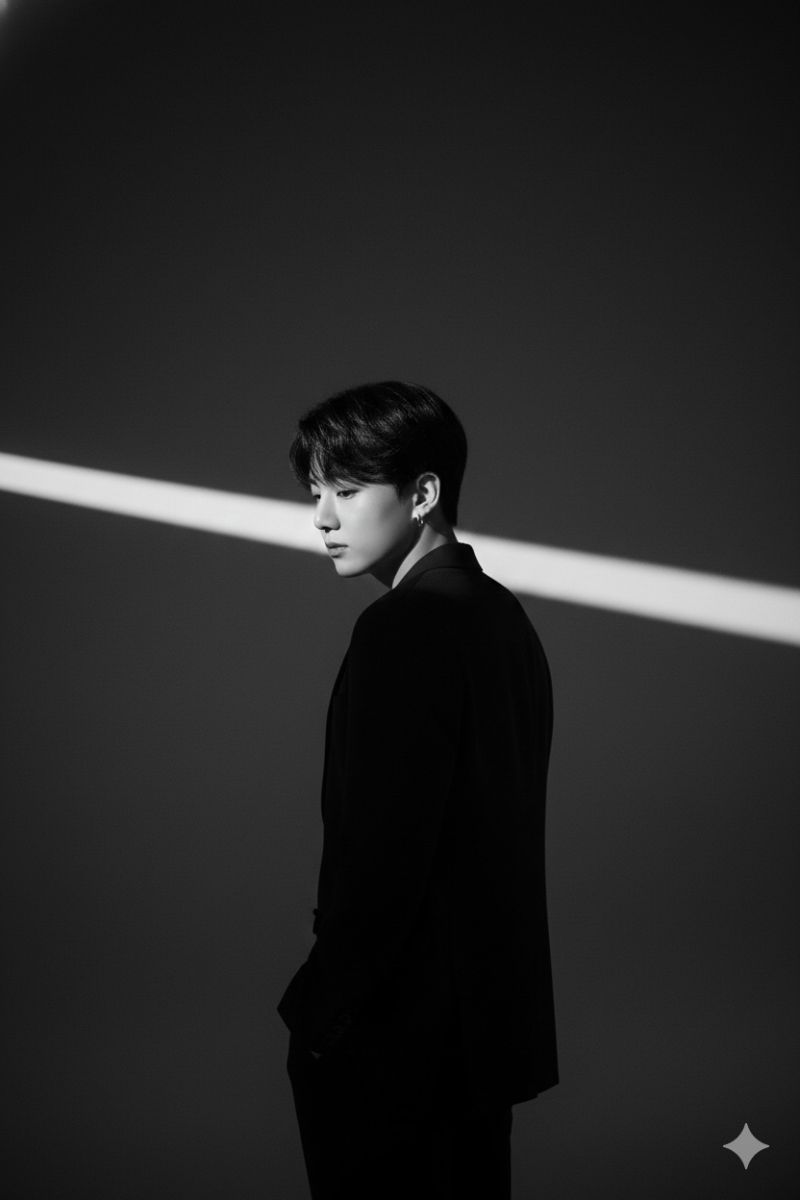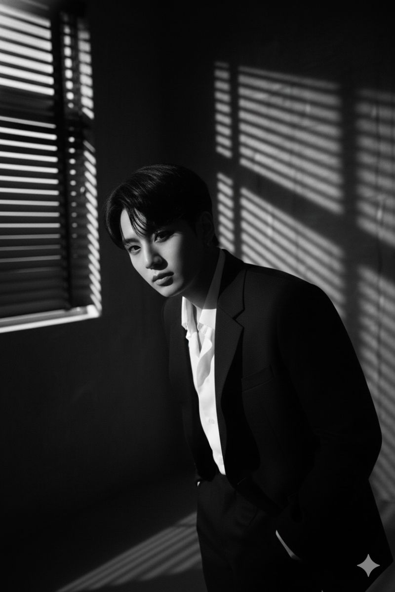 Mood & atmosphere: minimalist, moody, cinematic, evoking elegance and solitude. The subject wears a dark jacket, blending into the shadows for a sleek, editorial look.