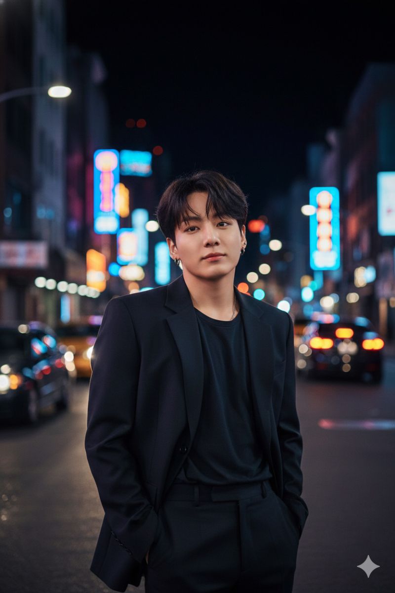 Preserve the original face from the uploaded image. Create a modern luxury street-style portrait. Outfit: tailored blazer combined with a dark t-shirt, minimal jewelry. Pose: standing casually, one hand in pocket, relaxed but confident expression. Background: urban night street with blurred neon lights. Lighting: mixed ambient city light and soft key light on the face. Mood: young, successful, confident, stylish. Cinematic color grading, 4K quality.