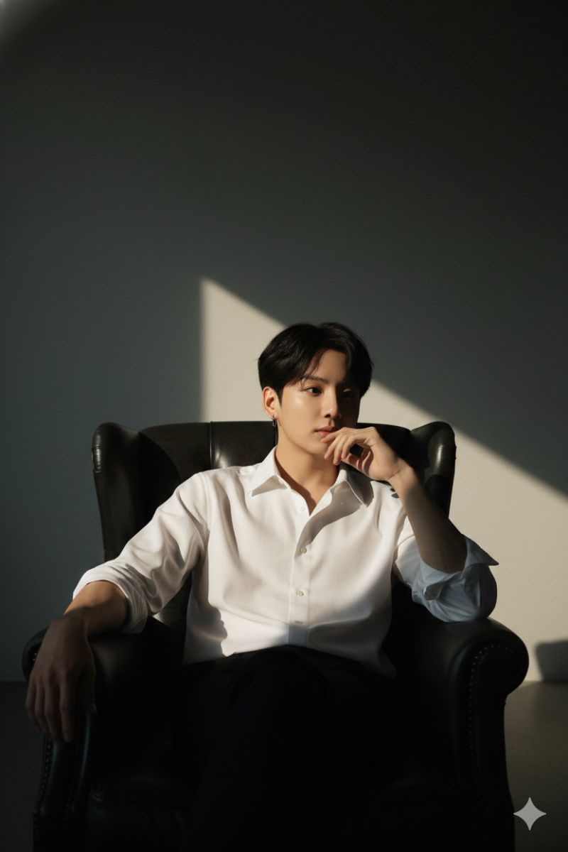 Create surreal DSLR portraits in a dark, cinematic atmosphere. Use uploaded photos of the subject, preserving their face and identity. Outfit: White shirt, sleeves slightly rolled up. Props: Dark leather armchair in a minimalist room. Background: A deep, dark wall illuminated by a warm, golden light beam. Pose: The model sits in a relaxed position, hand resting on chin, with a pensive expression. Lighting: Chiaroscuro style with contrast between warm highlights and deep shadows. Camera angle: Medium angle from the front, slightly tilted, emphasizing the dramatic light effects. Image quality: Standard 4K.