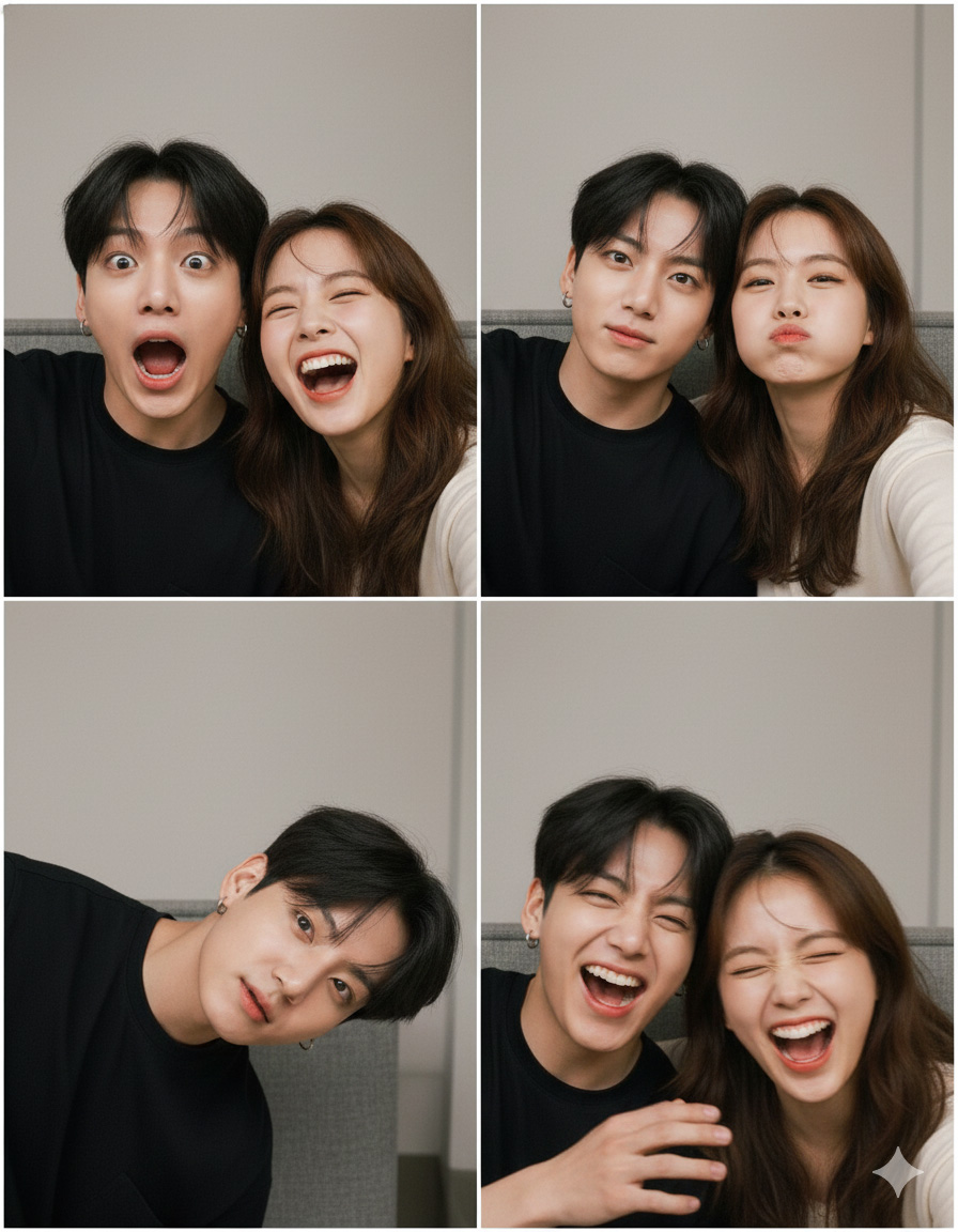 • Bottom-right: both burst into laughter, faces slightly flushed from flash.