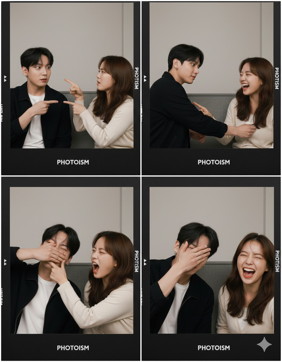 • Bottom left: The girl playfully pulls the guy's ear, while he pretends to fall out of the frame in the same way as the original pose; the girl laughs with her mouth open, her hair slightly messy; the flashes hit unevenly, like a chaotic, candid moment. • Bottom right: A boy gently holds a girl's head in a cute, messy pose, while both of them smile broadly and messily. The atmosphere feels like a couple's moment with excessive meme energy; the iPhone's flash is strong, and the photo booth frame is clean and simple.