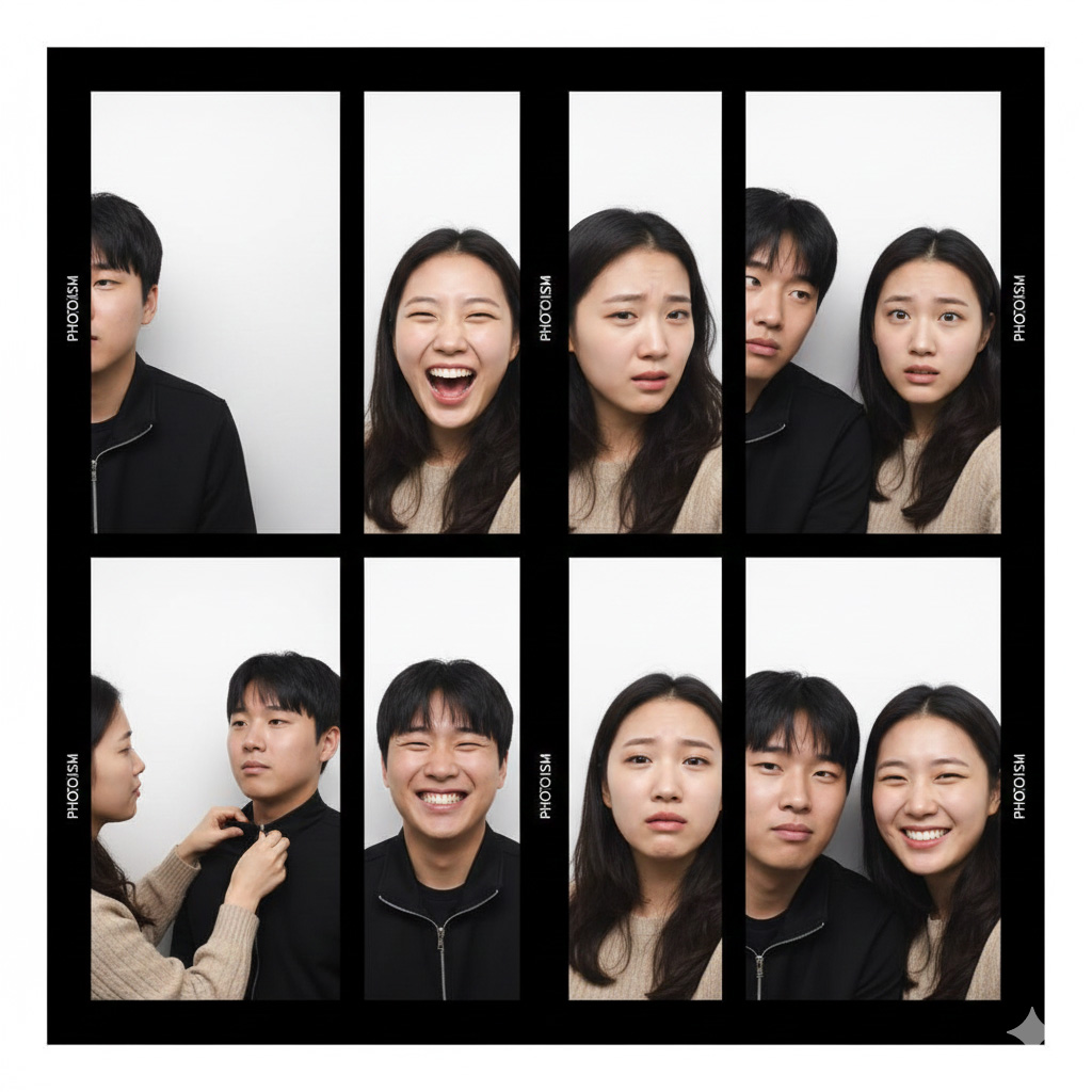 Overall: sweet, soft, Korean photobooth couple vibe, clean lighting, natural expressions, pastel tone.