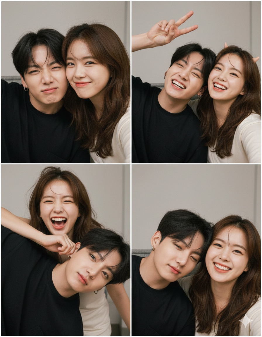Korean pastel photobooth style, soft cute couple energy, iPhone flash but gentle, high-resolution realistic faces.