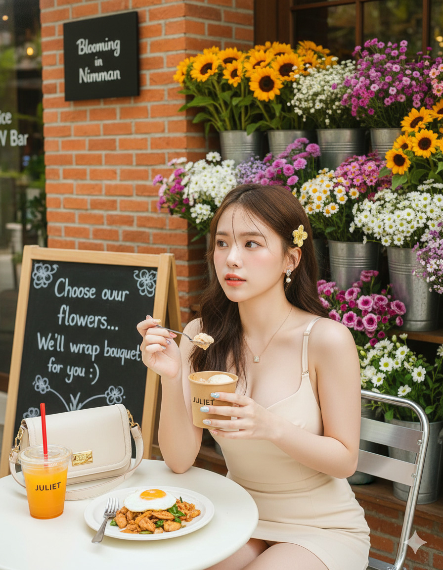 The scene/location is the facade of a flower shop or flower cafe called "Juliet Flower Bar," located in the Nimmanhaemin area of Chiang Mai City (look for the sign "Blooming in Nimman").
