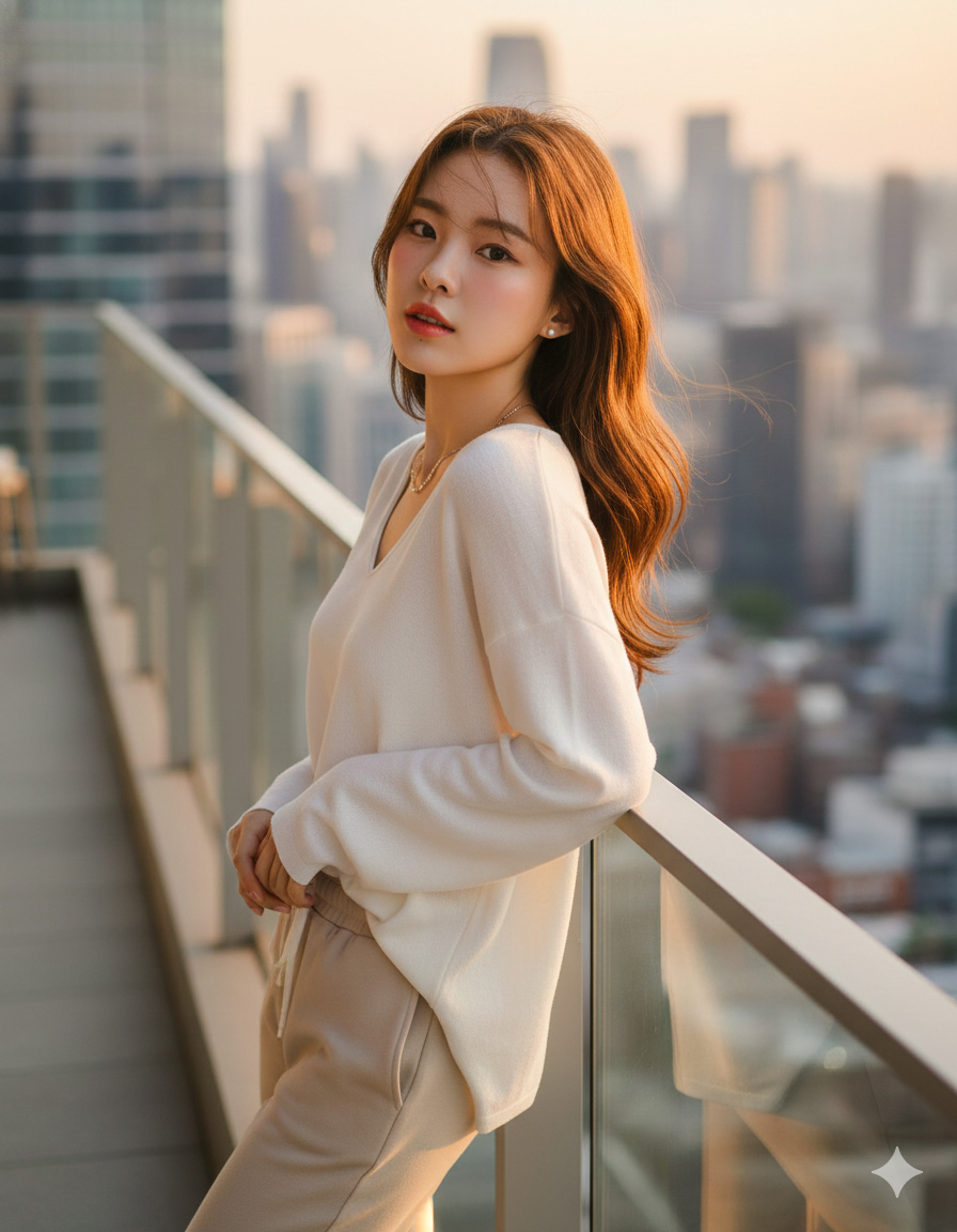 Posture: Standing relaxed, leaning lightly on the balcony railing, one hand touching the hair, eyes looking toward the camera.