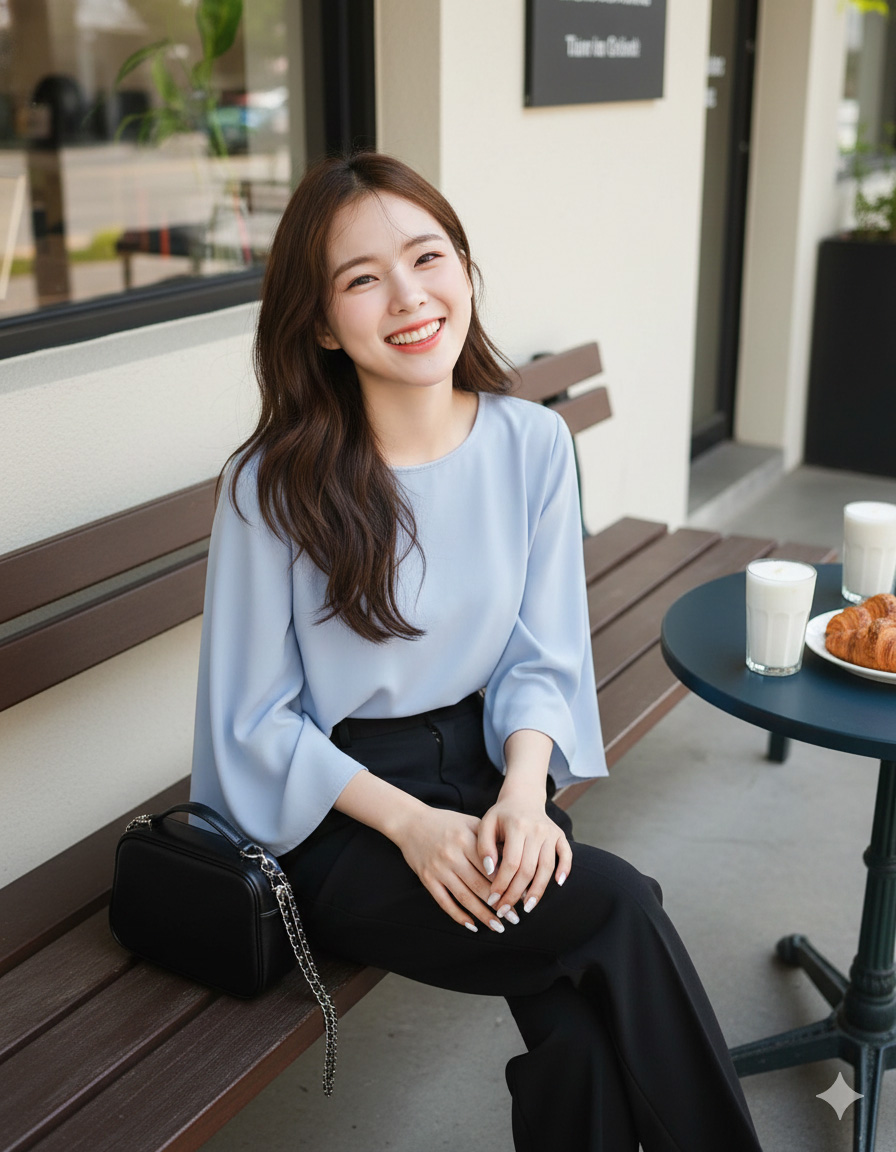 Posture: Sitting sideways at a café table, hands resting naturally, eyes looking toward the camera.
