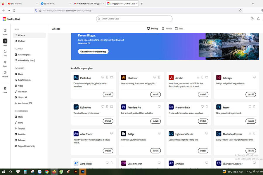 Khi mua Adobe Full App, bạn sở hữu toàn bộ hệ sinh thái phần mềm chuyên nghiệp từ Adobe trong một tài khoản duy nhất. Từ thiết kế đồ họa với Photoshop, Illustrator, InDesign đến dựng video bằng Premiere Pro, After Effects hay chỉnh sửa ảnh với Lightroom, mọi nhu cầu đều được đáp ứng trọn vẹn. Việc cài đặt và quản lý cũng trở nên đơn giản hơn bao giờ hết thông qua ứng dụng Creative Cloud Desktop, giúp bạn làm việc liền mạch mà không cần cài đặt rườm rà.