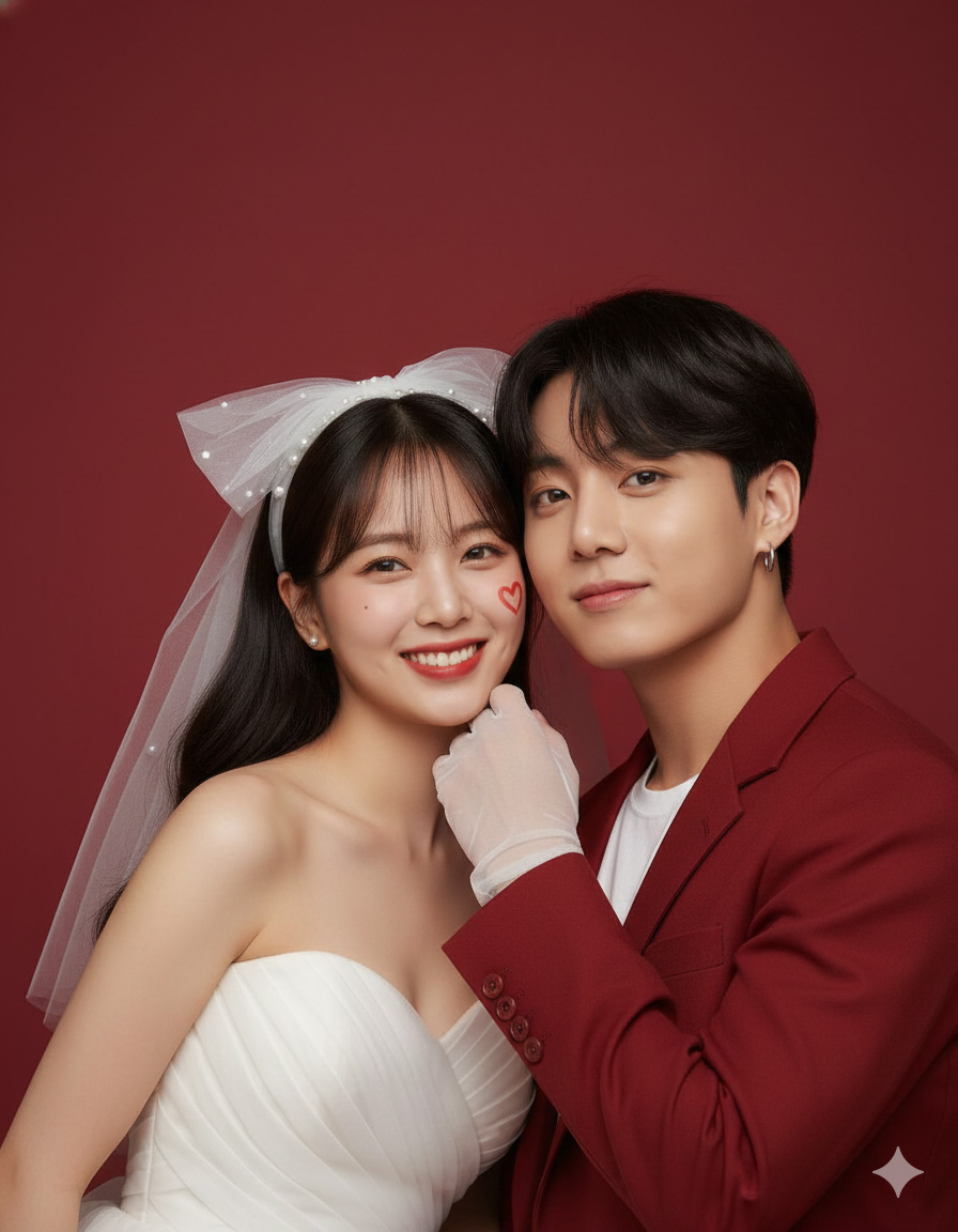 High-fidelity, true-to-source facial replication and maintain 100% facial likeness and true identity for each person. Preserve the original persons' attached images, faces, and physical features. Do not alter their appearances. Apply the following style: A vibrant, high-key studio portrait captured against a rich, solid deep red seamless backdrop, evoking a celebratory and romantic atmosphere. The lighting is soft, diffused, and even, providing a flattering glow that highlights the subjects and textures of their clothing, with subtle shadows adding depth. The color grading is warm and luminous, enhancing the vivid reds, crisp whites, and natural, glowing skin tones, creating a polished and professional aesthetic with sharp focus and a shallow depth of field that keeps the subjects prominent. The image features two people: Subject 1 is a female, positioned on the left side of the frame, slightly in front of Subject 2. Her body is angled slightly to the right, with her shoulders squared towards the camera. Her head is tilted slightly to her right, and she is smiling broadly, looking directly at the camera. Her right arm is bent, with her hand out of frame, appearing to rest on Subject 2's upper body. She wears a strapless gown crafted from layers of delicate white chiffon and organza, featuring gentle pleating and a flowing, ethereal texture. Her dark hair is styled in soft waves with a center part and light, wispy bangs framing her face, adorned with a sheer white organza bow veil embellished with small pearl accents. Her makeup is natural and radiant, with rosy cheeks, a warm red lip color, and a stylized red heart gently drawn on her right cheek. Subject 2 is a male, positioned on the right side of the frame, slightly behind Subject 1. His body is angled slightly to the left, with his left shoulder behind Subject 1. His head is tilted slightly to his left, resting close to Subject 1's head, and he is smiling gently, looking directly at the camera. His left arm is bent, and his hand, covered by a sheer white glove, is resting against Subject 1's chin and neck area.