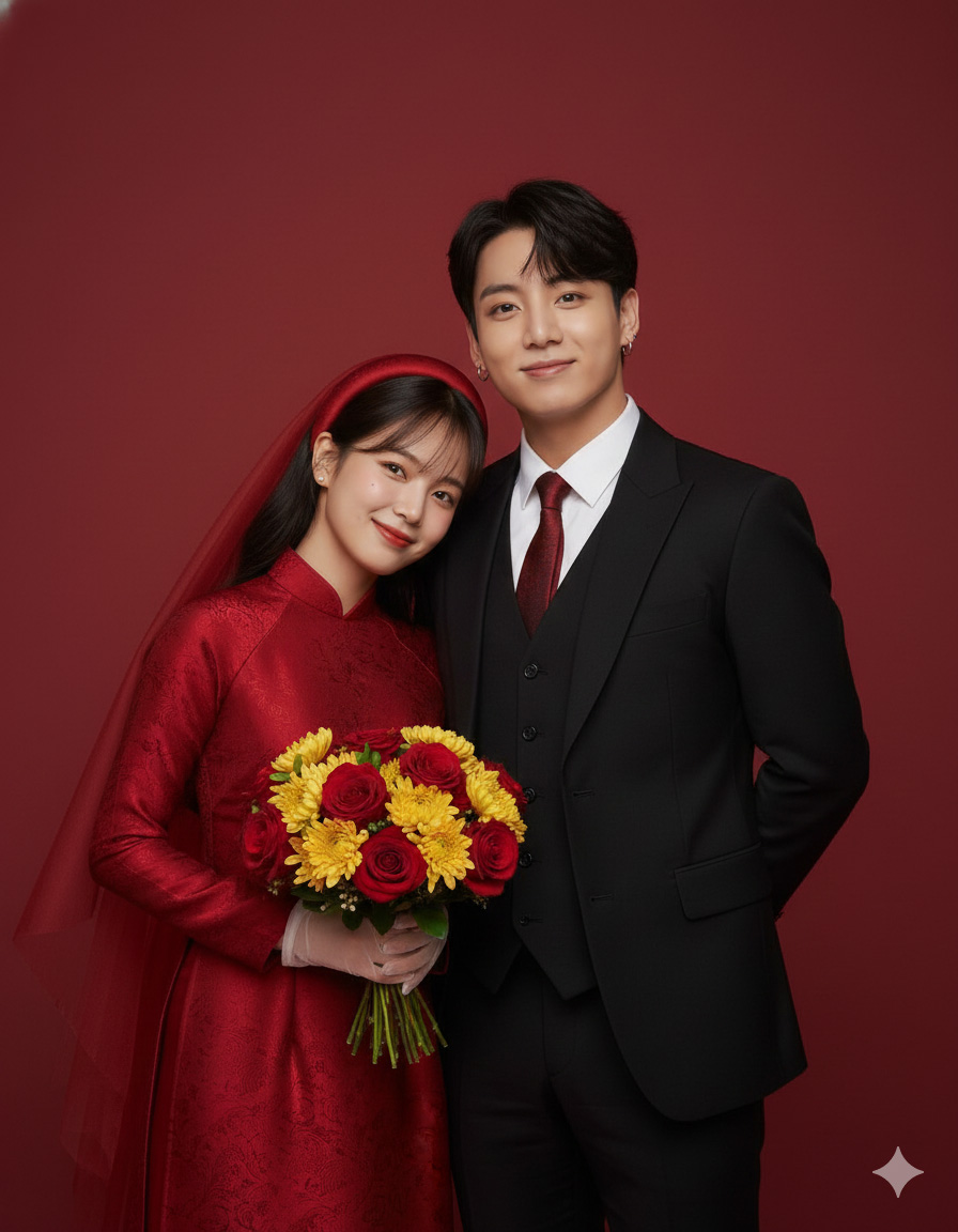 Ảnh cưới chụp studio của một cặp đôi trẻ trước phông nền đỏ rượu vang (burgundy). Chú rể mặc vest đen ba mảnh, áo sơ mi trắng và cà vạt đỏ họa tiết, đứng thẳng với tay đặt sau lưng, mỉm cười nhìn về phía máy ảnh. Cô gái mặc áo dài đỏ đô, đội khăn voan đỏ, hơi nghiêng đầu tựa lên vai chú rể, tay cầm bó hoa tông đỏ và vàng, biểu cảm dịu dàng, duyên dáng. Ánh sáng studio mềm, tông ấm, viền sáng tinh tế, độ sâu trường ảnh nông, phong cách chụp chân dung tối giản, photorealistic, siêu chi tiết - chú ý kết cấu da, vải lụa gấm và chi tiết hoa. Sử dụng ảnh đã tải lên làm tham chiếu và giữ nguyên biểu cảm khuôn mặt, góc nghiêng đầu và ánh mắt từ ảnh đã tải lên.