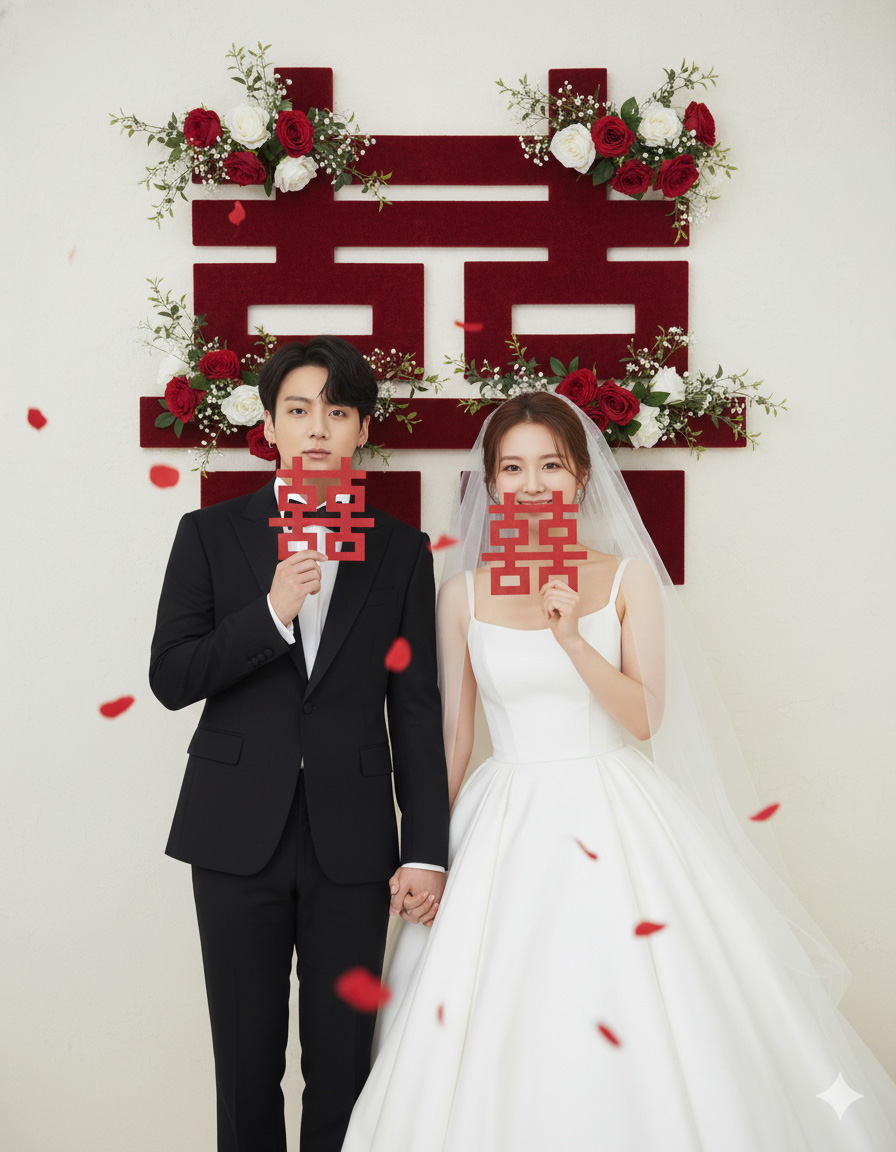 Tạo ảnh sử dụng chi tiết gương mặt nguyên bản của ảnh trên, không thay đổi chi tiết gương mặt, yêu cầu gương mặt giống nhất, tạo 1 phông nền màu trắng kem, 1 khung hình chữ song hỷ màu đỏ thẫm to hơn người, trên khung chữ hỷ có trang trí hoa tươi, cô gái váy cưới trắng bồng bềnh, phía sau tóc voan cưới, đứng cạnh chàng trai, tay cô gái cầm một hình cắt chữ hỷ màu đỏ và giơ lên tự nhiên sát bên cạnh mặt, giữ nguyên nét mặt và biểu cảm nhìn thẳng camera, chàng trai mặc vest đen, chàng trai 1 tay nắm tay cô gái, tay kia cầm một hình cắt chữ hỷ màu đỏ giơ lên tự nhiên sát bên mặt. Có hoa hồng rơi ở xung quanh. Ảnh chụp studio độ phân giải cao, chi tiết tinh xảo, mang vẻ đẹp thanh lịch và cao cấp.