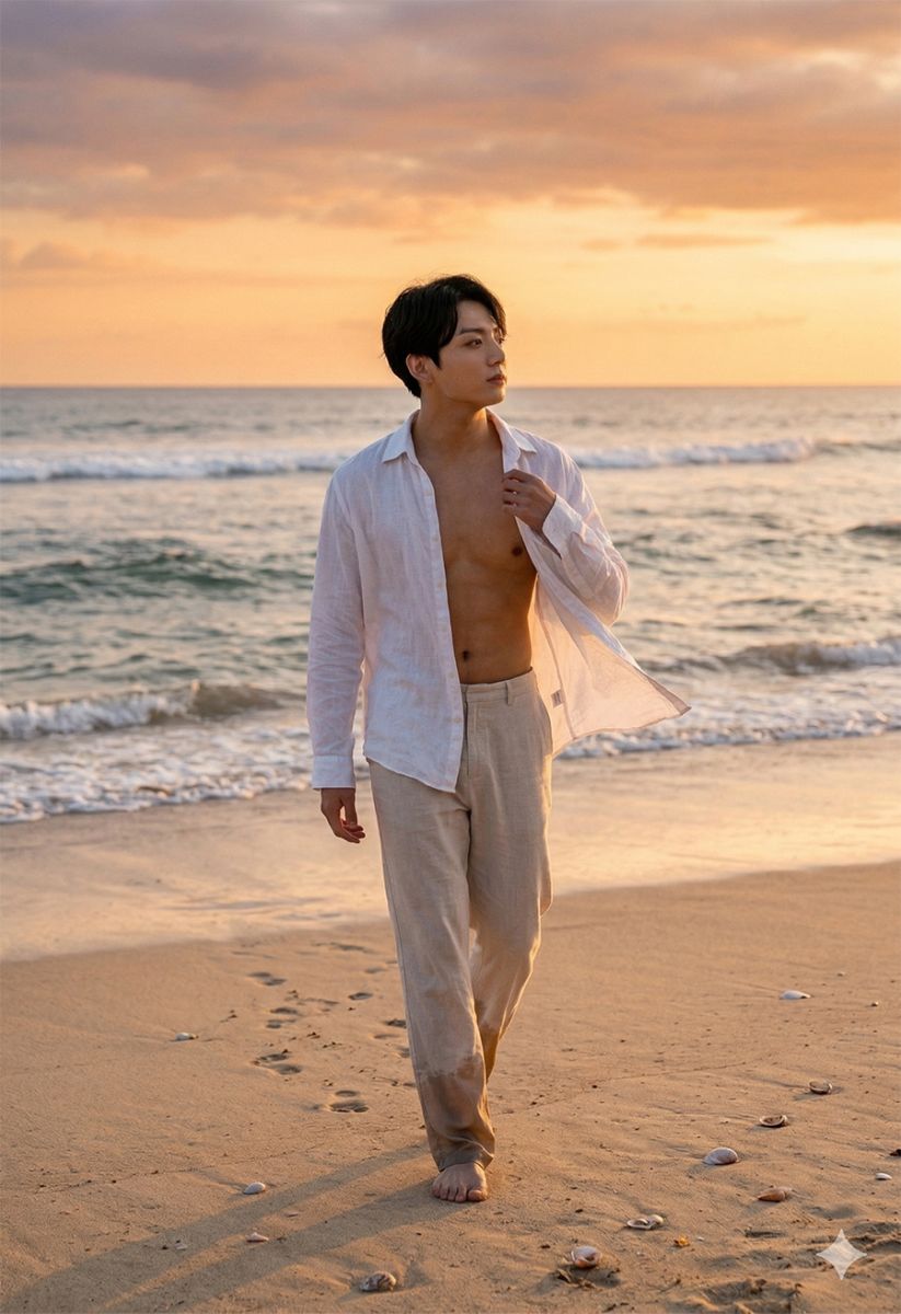 Use my exact facial identity from the reference image with zero modification. Create a hyper-realistic cinematic summer beach lifestyle photo. A young Southeast Asian man is walking slowly along the shoreline where gentle ocean waves softly touch his feet. He is wearing loose light-beige linen beach pants with the hem slightly wet from the seawater and an open lightweight white linen shirt fluttering naturally in the sea breeze, revealing a relaxed and natural body shape. His posture is confident yet calm, shoulders relaxed, one hand loosely adjusting the shirt collar while the other hand hangs naturally by his side. His expression is thoughtful and peaceful, eyes gazing toward the distant horizon as if enjoying the quiet beauty of the sunset.