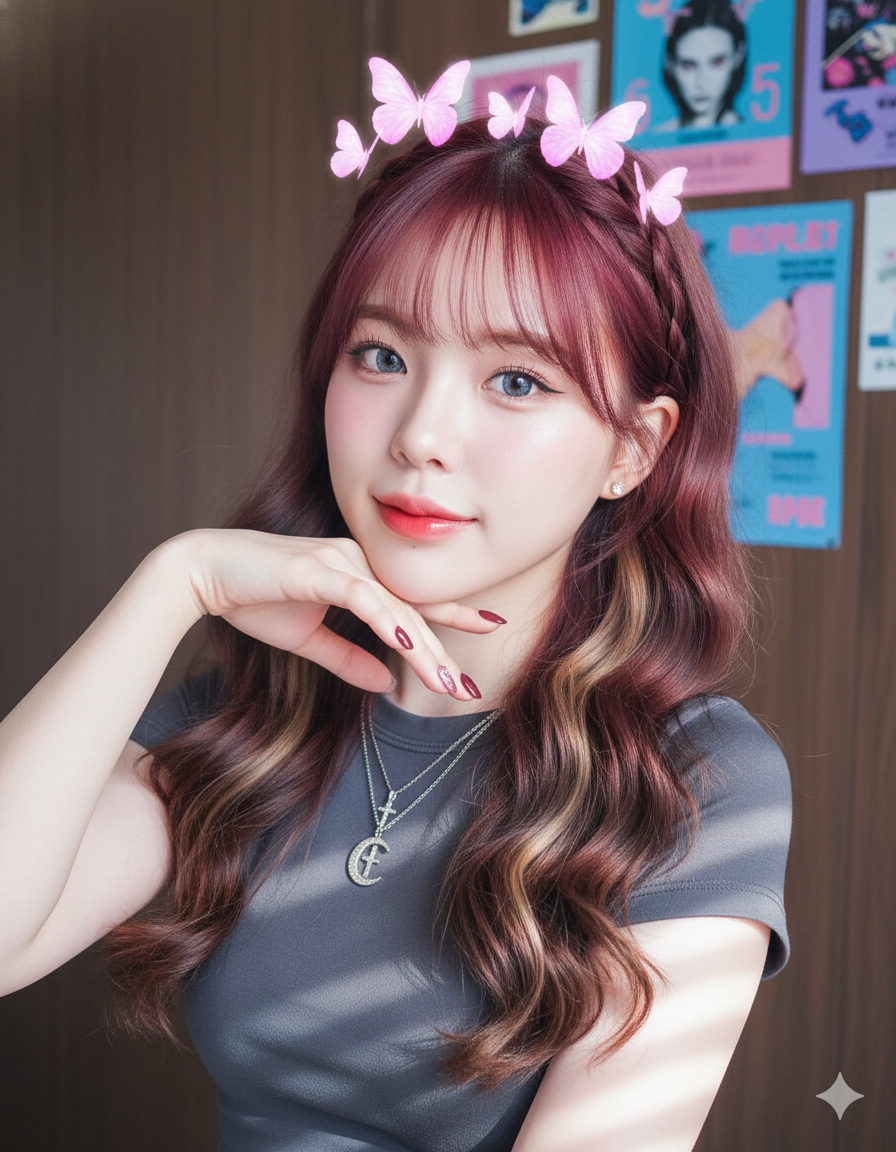 Make this photo not change the real face, a smooth white woman who is taking a selfie with her hand on her chin, she is in a room with a smooth brown wall background and there are blue and pink y2k posters, there is a lot of reflection of sunlight and it spreads smoothly and densely from outside so that it gives a shadow to her face and shines. Add an instagram effect of butterflies hanging above her pink head, she is wearing the clothes in the second picture, with long, naturally wavy hair in burgundy with blonde highlights. Her hair is arranged with a French braid or Dutch Braid that frames the face on both sides, then blends with the hair that flows freely at the back. The front bangs fall softly framing the forehead, with soft, dewy and radiant makeup, creating a healthy and awake appearance, large diameter soft lenses in bluish gray make the eyes wide and comfortable, pink blush and highlighter on the bridge of the nose and cheekbones. Long, curly eyelashes that emphasize her big eyes, cat eye eyeliner, neat eyebrows, clean white skin, with shiny lips, reddish ombre cream glossi. She also wears diamond earrings and a necklace, and her nails are painted with glossy maroon nail polish. The photo quality is high resolution. The ratio is 9:16. Don't change the reference face even a little.