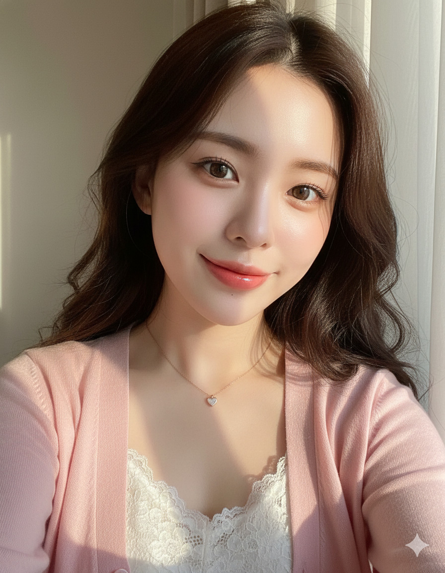 She wears light Korean makeup: soft peach blush, gradient pink lips, thin eyeliner, and natural eyebrows.