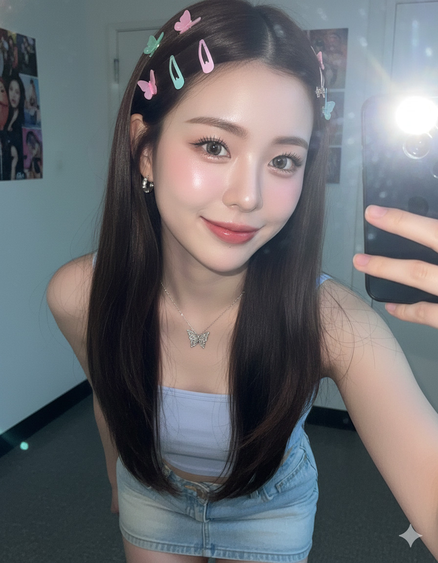 Create a Y2K cute-style selfie of a young woman with long straight hair and small hair clips.