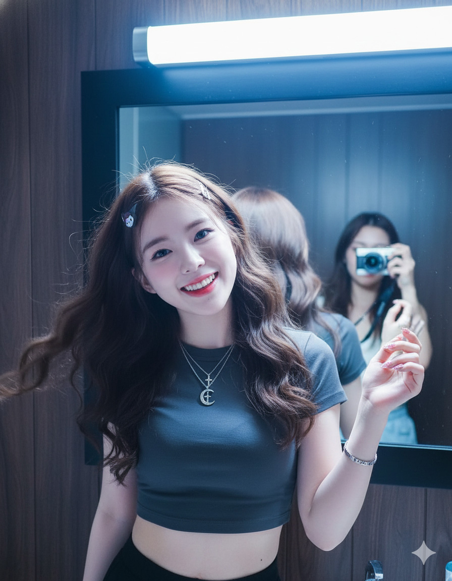 Please keep my original face 100%, no facial details modified. Create a portrait of a teenage girl with long, soft, and soft curls, dark brown hair color, and a Sanrio Kuromi hair clip. She wears a dark gray crop top, a silver chain necklace with a dangling moon pendant, adding charm and enhancing her figure, highlighting the curves of her waist. Her skin is pinkish white, smooth, and has a slight pink tone. Her eyes are bright, with blue-gray contact lenses, light pink makeup, long eyelashes, a thin, sharp eyeliner, and pink-red lip gloss on her lips. Her fingernails are painted with clear glittery pink. She wears a silver bracelet and a silver necklace with a minimalist cross pendant. She leans to the side, her hair is lifted in a playful, sexy pose. She raises her hand slightly. The background is a bathroom with dark wooden walls. The flash mirror reveals the model's faint reflection in the mirror. The photo was taken with a Canon IXY/IXUS camera with a strong flash in front of the face, creating a Y2K Digital Aesthetic / Cyber Ulzzang / Retro Japan–Korea look (the reflection in the mirror is the hand of another woman taking a photo of the model). The flash is bright white light, making the skin appear shiny, glossy, and bright. It has high contrast and a slightly cool blue tone, creating a mysterious yet sharp atmosphere, reminiscent of an early 2000s digital photograph.