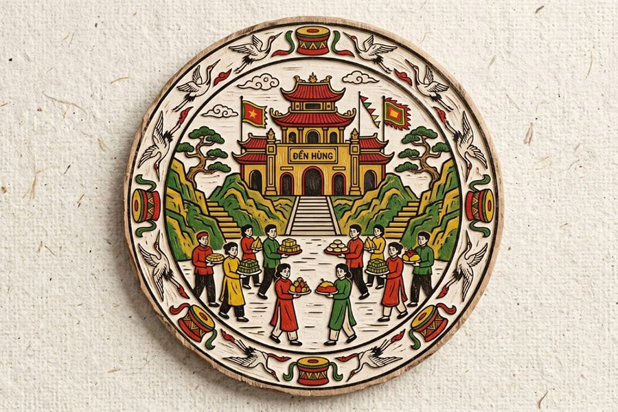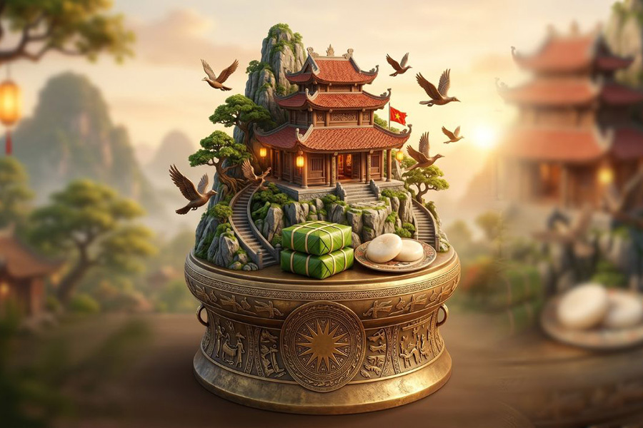 Sử dụng từ khóa cụ thể: “icon Giỗ Tổ Hùng Vương”, “đền Hùng”, “trống đồng”, “bánh chưng bánh giầy”