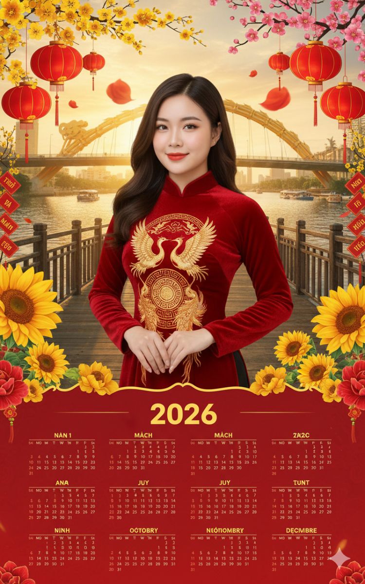 Thiết kế poster lịch treo tường 12 tháng trọn bộ cho năm 2026 theo phong cách Tết [Đỏ Vàng] Sang Trọng. Điểm nhấn là [cô gái trẻ] đang tạo dáng (giữ nguyên đường nét thanh tú, nụ cười và ánh mắt dịu dàng như ảnh gốc. Sử dụng ảnh đính kèm làm tham chiếu duy nhất cho khuôn mặt. làm mịn da nhưng Tuyệt đối không thay đổi cấu trúc xương mặt, giữ nguyên hình dáng mắt và mũi. Yêu cầu độ giống 100% so với ảnh gốc. Ưu tiên đặc điểm nhân vật trong ảnh hơn là sự sáng tạo của AI. màu sắc của nhân vật đồng nhất với màu và ánh sáng của tổng thể bức ảnh. tạo dáng [duyên dáng trong tà áo dài nhung đỏ truyền thống thêu chỉ vàng đôi chim hạc và trống đồng đông sơn tinh xảo, tôn lên vẻ đẹp Á Đông thanh lịch]. Phông nền là [phong cảnh tại cầu rồng đà nẵng], được biến hóa đầy nghệ thuật với không khí Tết ngập tràn những [cành mai vàng, hoa đào, hoa hướng dương rực rỡ và những chiếc đèn lồng đỏ phấp phới trong gió]. Ánh nắng vàng ấm áp tạo nên chiều sâu điện ảnh, làm nổi bật sự tương phản giữa sắc đỏ may mắn của trang phục và sắc xanh của thiên nhiên. Bố cục ảnh dọc cân bằng 3:4 tạo nên một không gian tinh tế, thoáng đãng, phù hợp với bộ số lịch năm 2026, mang đến cảm giác hân hoan, sung túc, khởi đầu một năm mới an khang thịnh vượng.