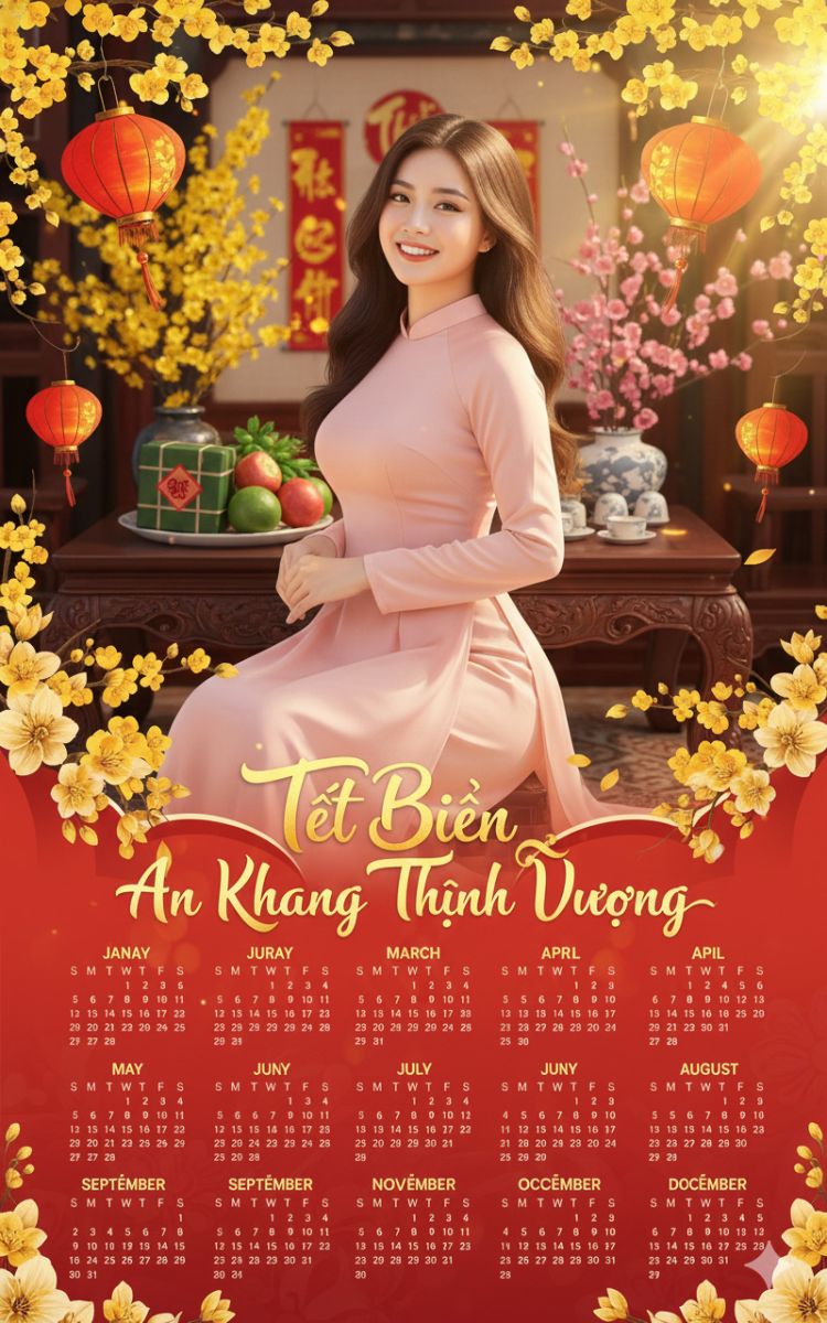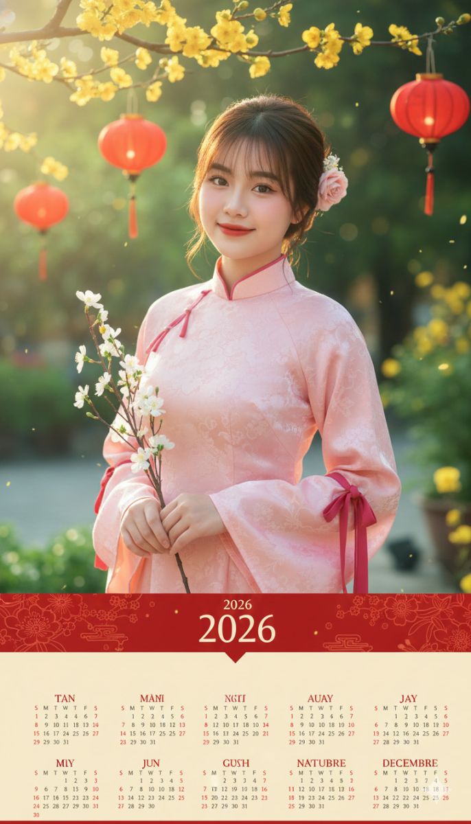 Thiết kế một lịch treo tường 12 tháng cho năm 2026 sao cho ngày 1 tháng 1 năm 2026 bắt đầu là thứ 5, tháng 2 có 28 ngày, thứ - ngày - tháng phải chính xác như lịch thật năm 2026 thiết kế theo phong cách Red - Gold Luxury Tết. Nhân vật trung tâm là cô gái trẻ (giữ nguyên toàn bộ đường nét khuôn mặt tinh tế, nụ cười dịu và ánh mắt trong trẻo từ ảnh gốc), tạo dáng duyên dáng trong tà áo dài hồng pastel chất liệu gấm hoa văn nổi tinh xảo. Tay áo rộng, mềm rũ, dây buộc màu hồng đậm làm điểm nhấn. Cô gái ôm một nhánh hoa trắng nhỏ, tạo cảm giác mùa xuân tươi sáng. cô trang điểm Má hồng nhẹ. Môi hồng bóng nhẹ, căng mịn. Tóc búi thấp, thả vài sợi lưa thưa tạo độ bay tinh tế, Mái thưa ôm nhẹ gương mặt, tạo vẻ trẻ trung, Cài hoa hồng pastel phía sau tai, tạo điểm nhấn nữ tính Bối cảnh: Hậu cảnh ngoài trời, bokeh xanh lá mềm Toàn cảnh được cách điệu theo không khí Tết: những nhánh mai vàng rực rỡ bung nở, đèn lồng đỏ bay nhẹ trong gió biển. Ánh sáng: ánh nắng vàng ấm áp tạo chiều sâu điện ảnh, làm nổi bật sự tương phản giữa sắc đỏ may mắn và sắc xanh của thiên nhiên. Bố cục ảnh: khổ dọc 3:4, cân đối, để chừa khoảng không tinh tế, thoáng đãng cho phần lịch năm 2026.