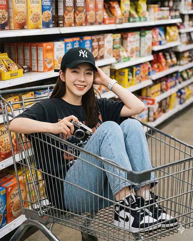 Create an image from the original portrait of the person, sitting inside a large shopping cart of a supermarket that can fit the whole body and legs. The cart is slightly tilted to the side, with the right arm resting on the cart’s edge. Both legs are bent inside the cart, with knees up, and the whole body including both legs remain inside the cart, not outside. The pose looks relaxed and confident. The setting is inside a supermarket, side view angle, with soft ambient lighting emphasizing shadows and depth. Outfit: light straight-cut jeans, oversized black vintage graphic t-shirt, black cap with a white “NY” logo, black and white Nike Jordan sneakers, and a white smartwatch. The person is holding a camera. The overall mood is stylish yet cute. The face must be 100% identical to the original person, sharp and detailed, with a close-up realistic photo look.
