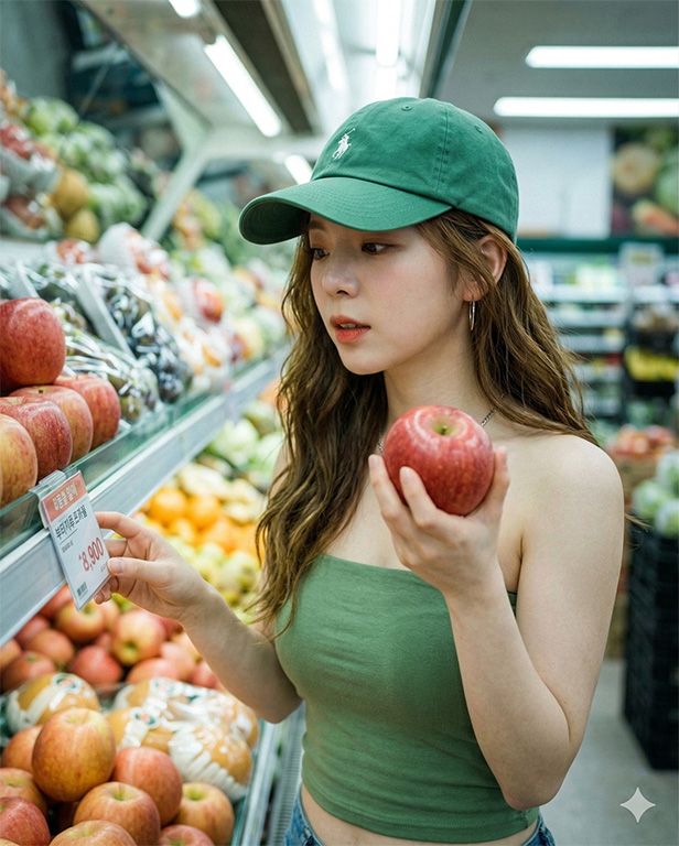 Use this uploaded image as face reference, preserve the facial identity, skin tone, and natural proportions. High-detail photorealistic casual portrait. Outfit: Green tube top with green cap, paired with white denim jeans Hairstyle: Loose wavy hair flowing naturally Pose: Half-body shot, holding a fruit in one hand, other hand checking price tag with curious expression Accessories: Minimal earrings Background: Fresh produce section in supermarket Lighting: Bright indoor supermarket light softened with cinematic effect Mood: Cute, candid, stylish, realistic everyday vibe